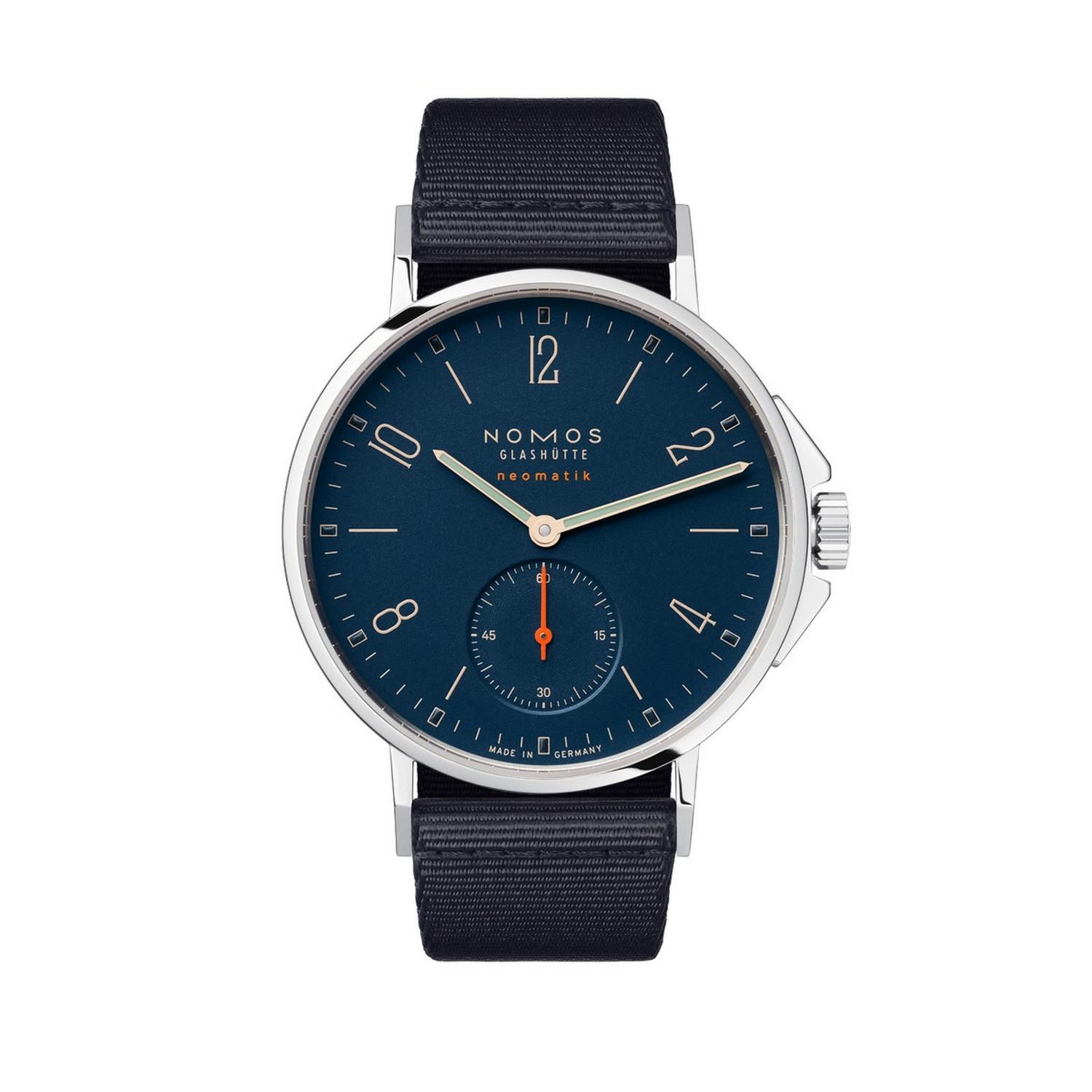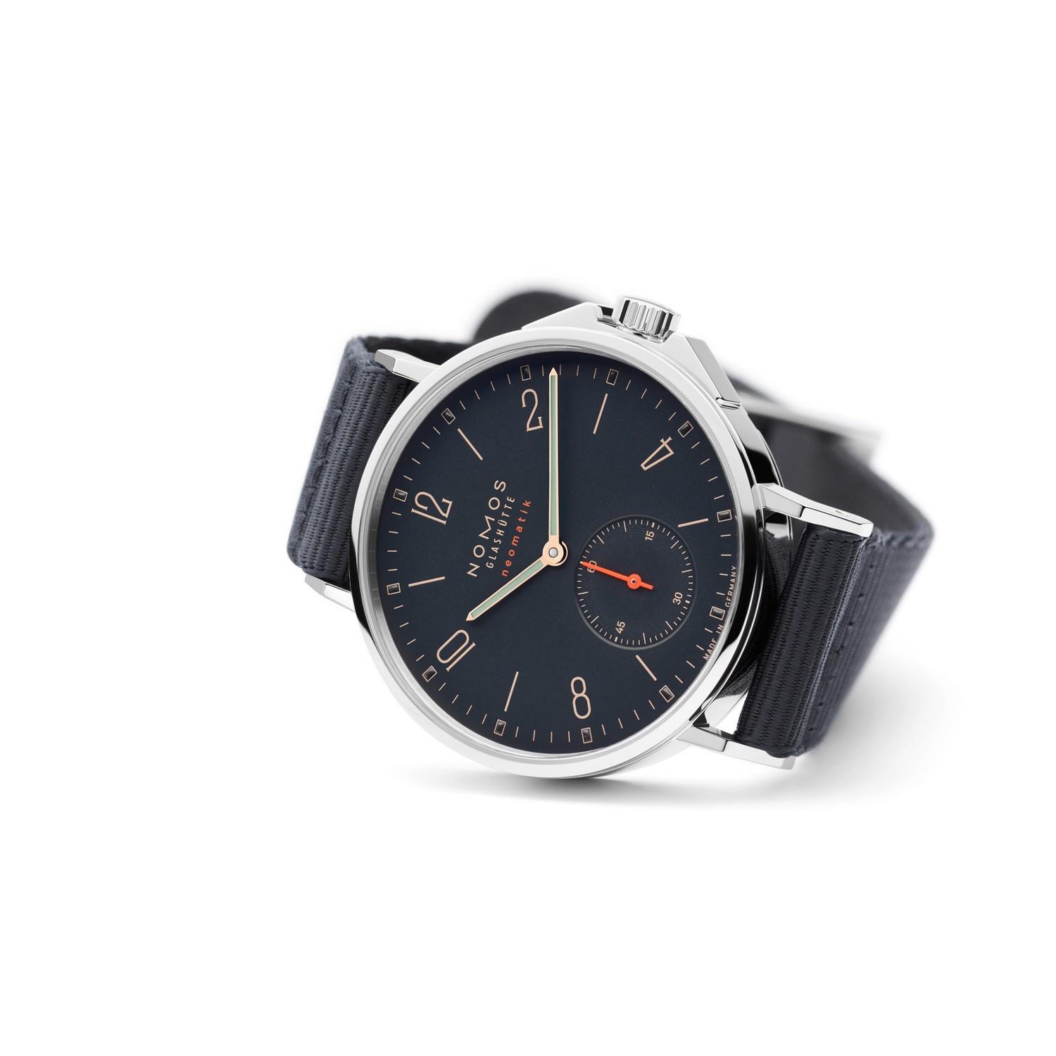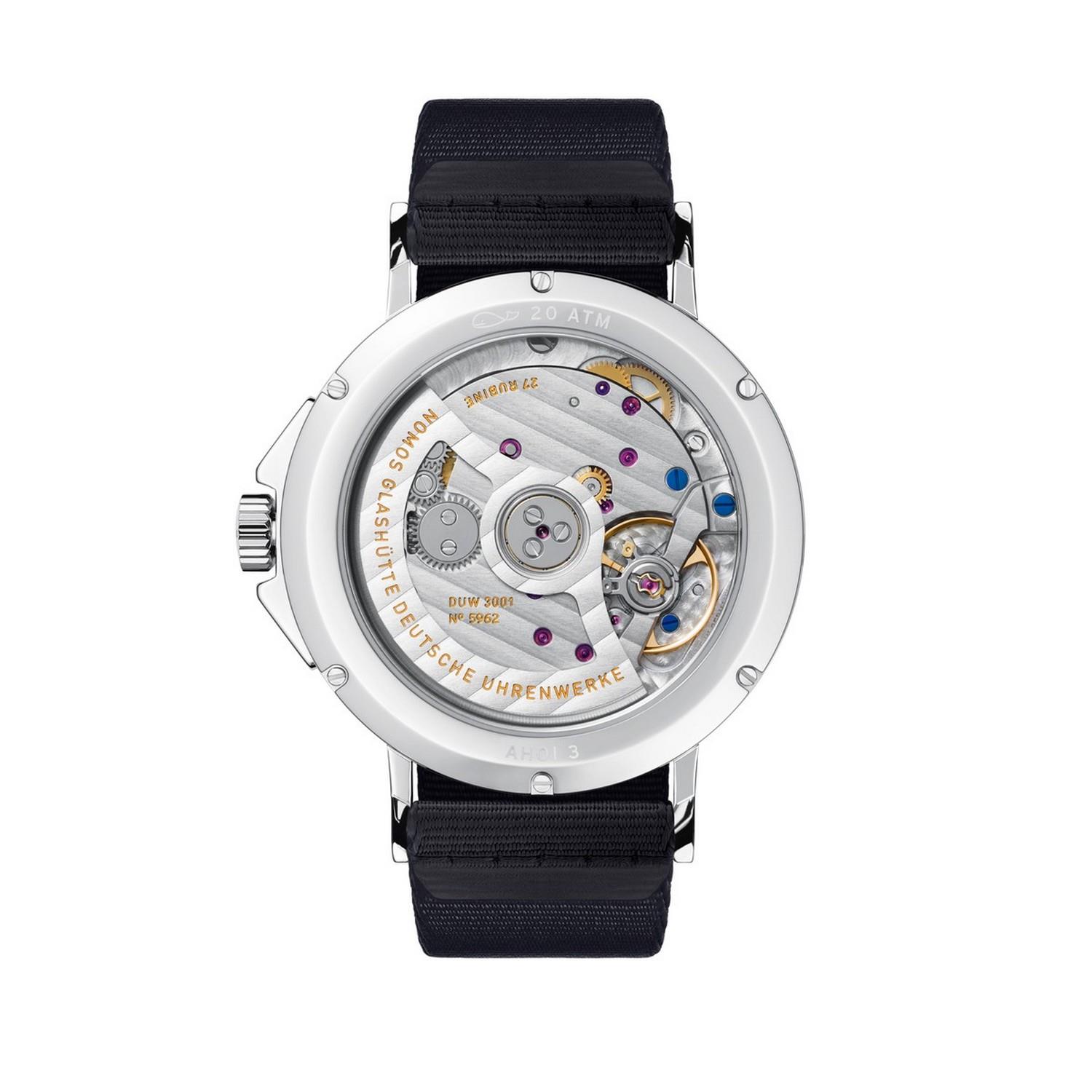 Fast schwarz – aber nur fast. Diese Uhr trägt die Farbe des Ozeans bei Nacht, denn sie verträgt auch schwere See. Leuchtzeichen setzen das Gold der Zeiger, das Neonorange in der kleinen Sekunde. Im Innern: das ultraflache Automatikkaliber DUW 3001, geschützt durch den sechsfach verschraubten Boden, Saphirglas, Kronenschutz.