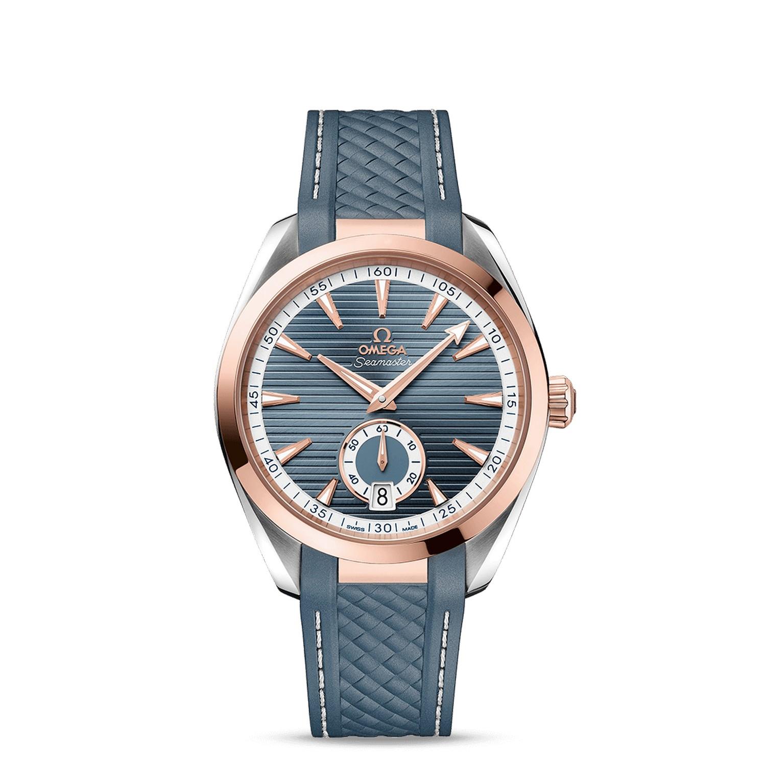 Die Seamaster Aqua Terra ist eine Hommage an OMEGAs großes maritimes Erbe. Das symmetrische Gehäuse dieses 41-mm-Modells besteht aus 18 K Sedna™-Gold und Edelstahl und ist auf dem Gehäuseboden mit einem Wellendekor versehen.