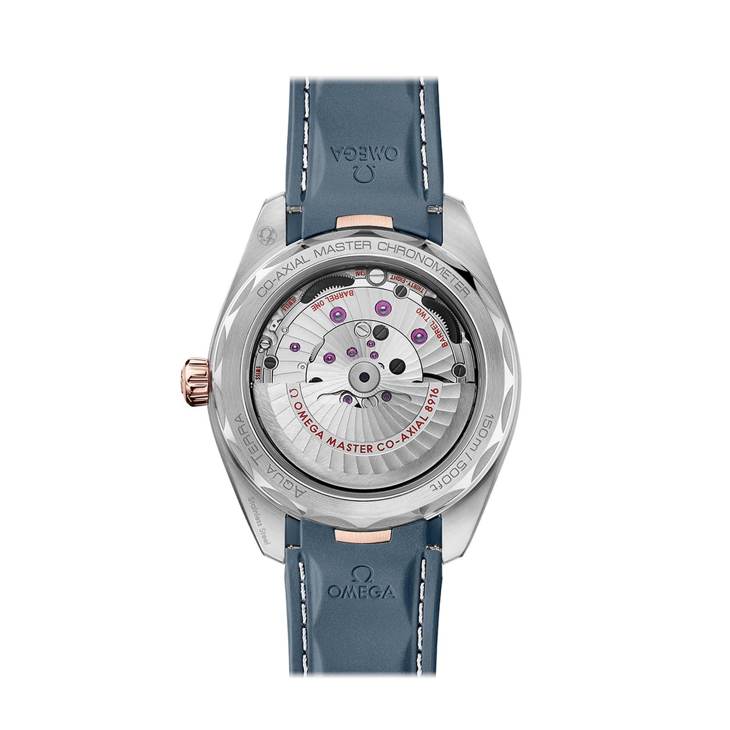 Der Zeitmesser wird von einem strukturierten, blauen Kautschukarmband mit grauer Naht am Handgelenk gehalten und von dem OMEGA Co-Axial Master Chronometer Kaliber 8916 angetrieben, das vom Eidgenössischen Institut für Metrologie (METAS) zertifiziert wurde und höchsten Branchenstandards entspricht.