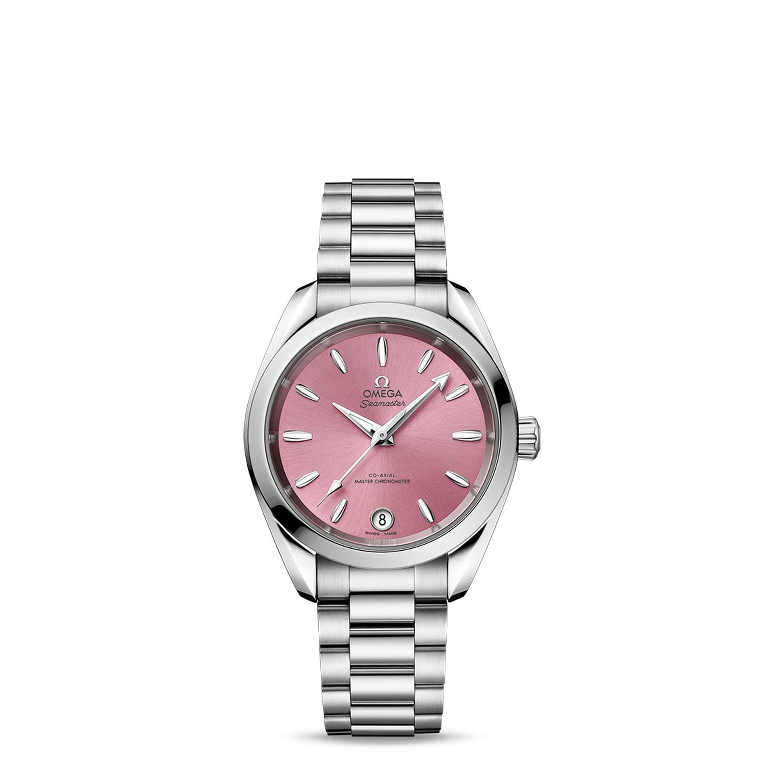 Die Seamaster Aqua Terra ist eine Hommage an OMEGAs großes maritimes Erbe. Dieses 34-mm-Modell verfügt über ein symmetrisches Gehäuse und eine Krone aus vollständig poliertem Edelstahl und ein Wellendekor auf dem Gehäuseboden.