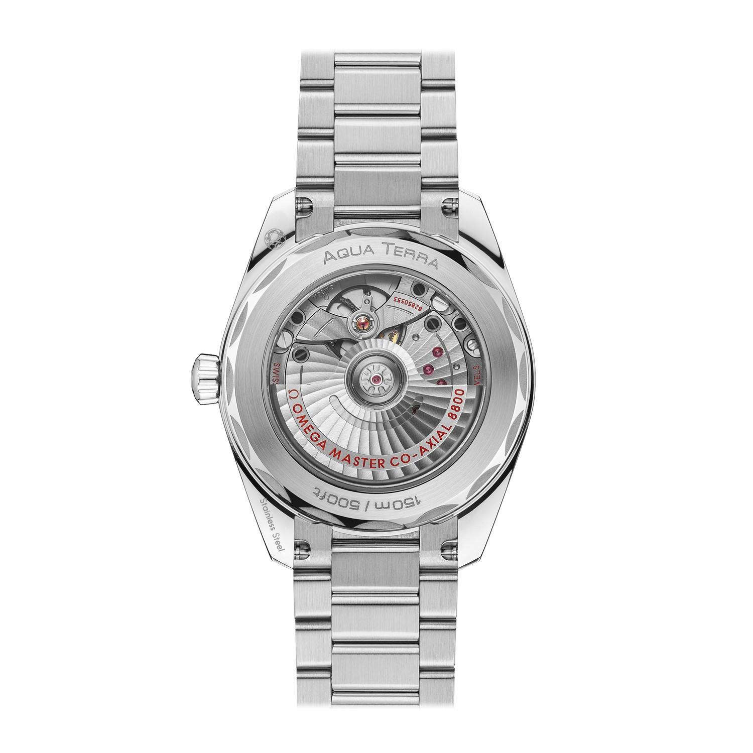 Die Seamaster Aqua Terra ist eine Hommage an OMEGAs großes maritimes Erbe. Dieses 38-mm-Modell verfügt über ein symmetrisches Gehäuse und eine Krone aus vollständig poliertem Edelstahl und ein Wellendekor auf dem Gehäuseboden.