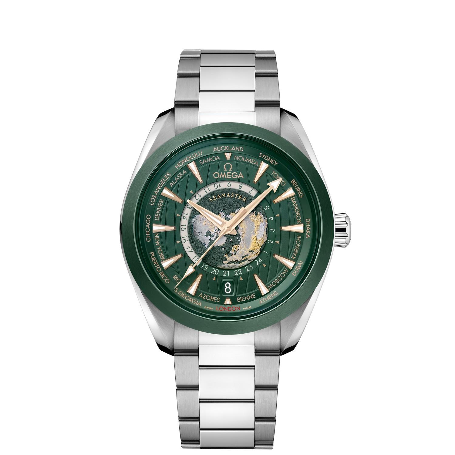 In der Mitte des grünen Zifferblatts mit Sonnenschliff, das von einer Lünette aus polierter und gebürsteter grüner Keramik eingerahmt wird, hat OMEGA eine Vision der Erde aus Sicht des Nordpols geschaffen, indem Kontinente und Farben auf eine Oberfläche aus Titan Grade 5 gelasert wurden. Um die topografische Karte herum ist eine 24-Stunden-Anzeige angebracht, die in Tag- und Nachtabschnitte unterteilt ist.