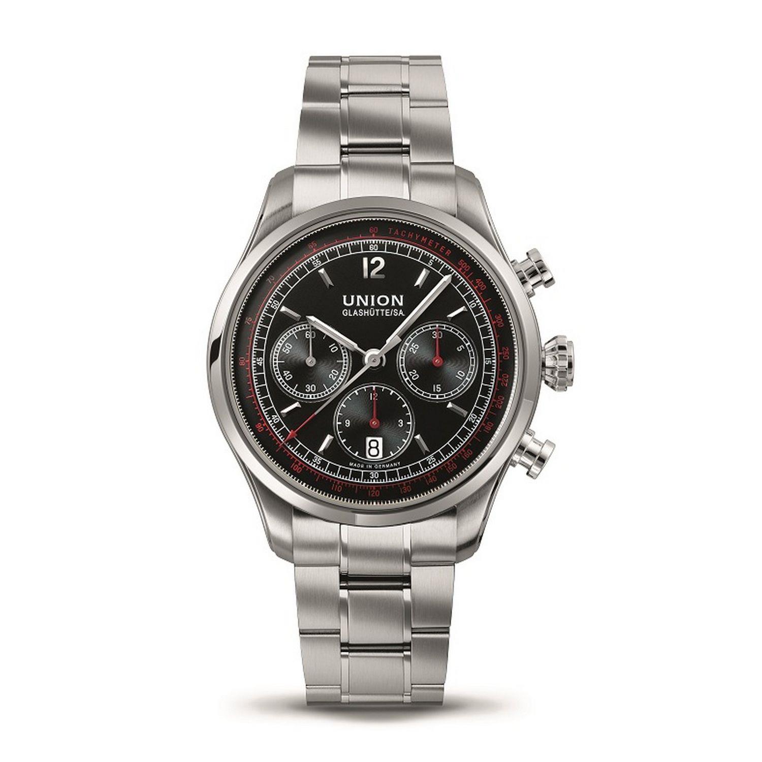 Bei diesem Chronographen gibt es viel zu entdecken – auf den ersten Blick und immer wieder aufs Neue: Das sanft gewölbte, schwarze Zifferblatt und die Totalisatoren werden von feinen Bahngleis-Minuterien geziert. Für einen Hauch Farbe sorgt das leuchtende Rot von Tachymeterskala und Chronographenzeiger. Die Kurzzeitmessung erfolgt mit Hilfe von zentraler Stoppsekunde, 30-Minuten- und 12-Stunden-Zähler. Sie wird ergänzt von einer kleinen Sekunde bei 9 Uhr und dem Datumsfenster bei 6 Uhr. Vernickelte Ziffern und aufgesetzte Indizes setzen fein glänzende Highlights.