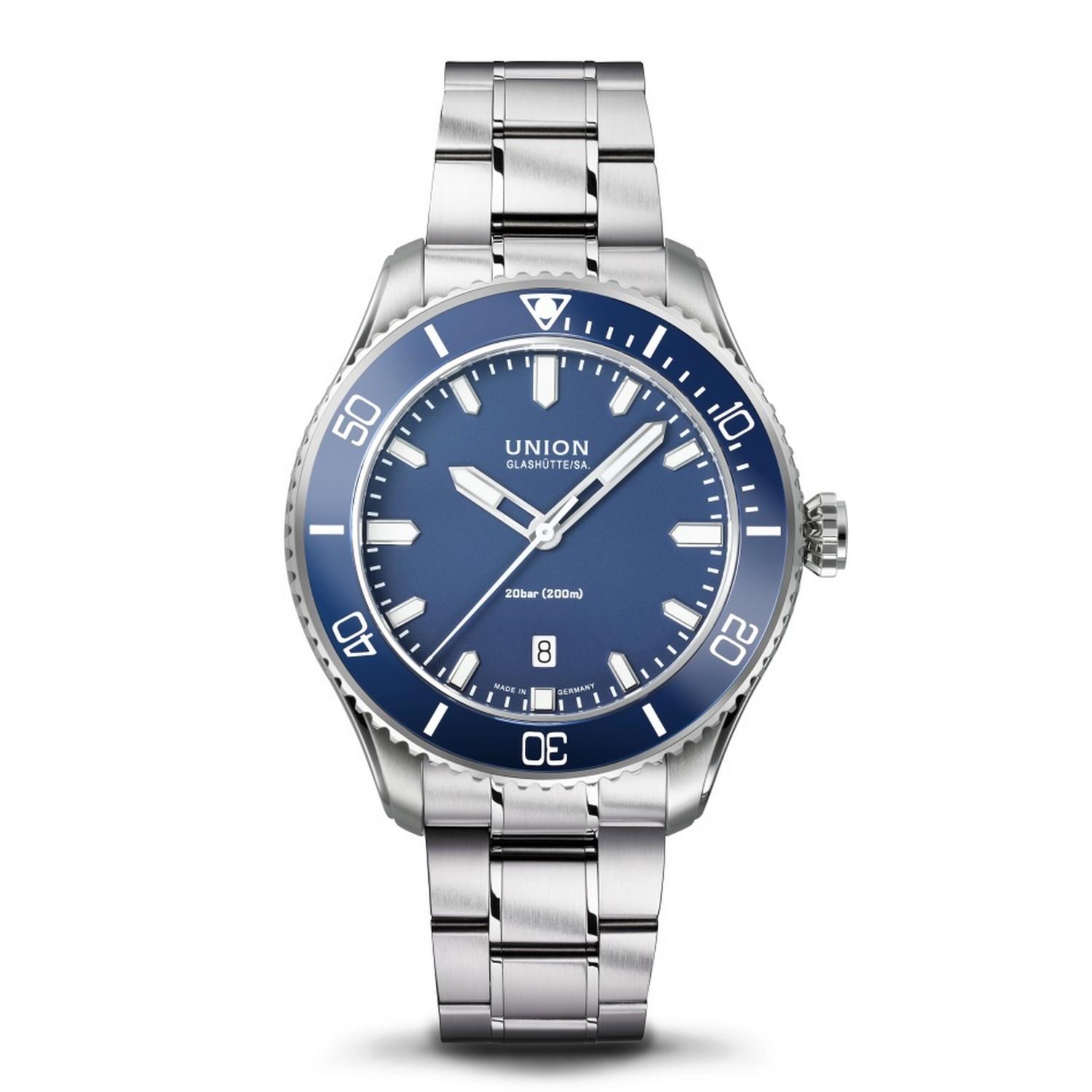 Die Belisar Datum Sport mag es gradlinig: Ihr reduziertes Design hinterlässt einen starken Eindruck. Das markante Edelstahlgehäuse von 45 mm Durchmesser ist mit den typischen aufgeschraubten Gehäuseflanken der Belisar-Linie versehen. Die Drehlünette ist, wie das Uhrenglas selbst, aus kratzfestem Saphirglas gefertigt und daher extrem widerstandsfähig. Das gilt auch für ihre Leuchtmarkierung, die aus diesem Grund gut geschützt unter dem Glasring angebracht wurde. Eine verschraubte Krone und der verschraubte Saphirglasboden sorgen für eine Wasserdichtigkeit bis 20 bar. Dank ihrer beiden Wechselbänder aus Edelstahl und blauem Textil kann der Look der Uhr unkompliziert dem aktuellen Stil und Anlass angepasst werden.