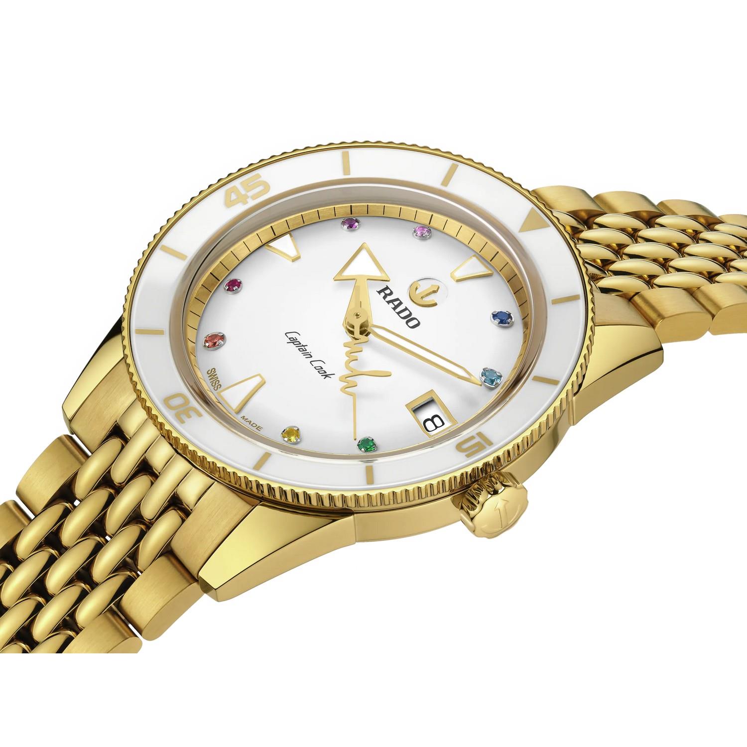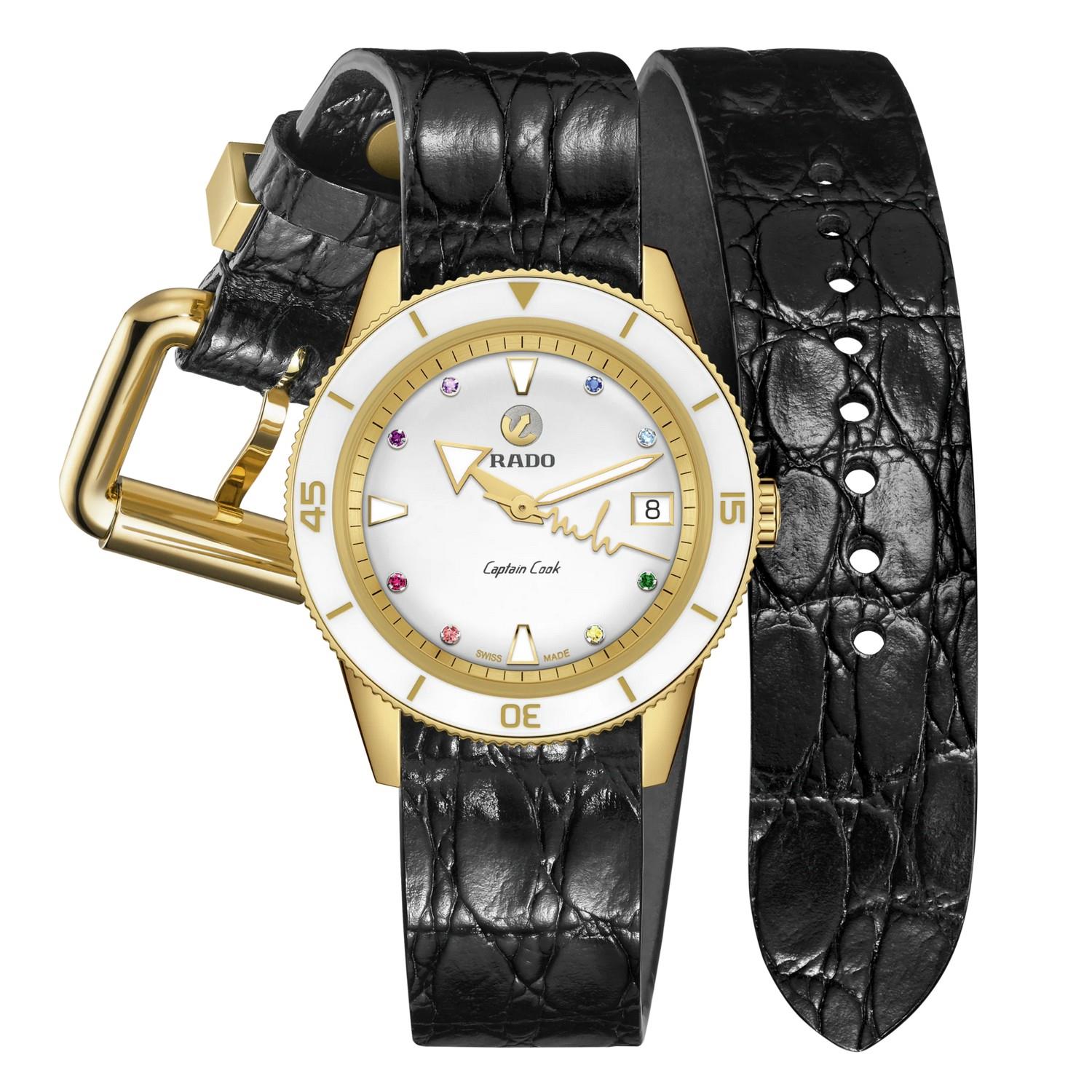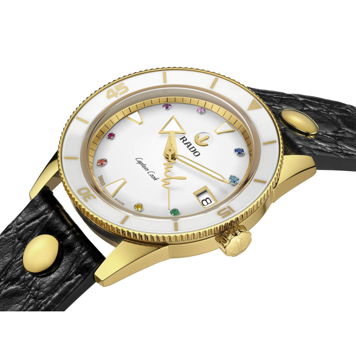 Die Captain Cook x Marina Hoermanseder, auch „Heartbeat“ oder Herzschlag genannt, ist bereits die zweite Uhr, die als Sonderedition in Zusammenarbeit mit Marina Hoermanseder kreiert wurde. Die preisgekrönte österreichische Modedesignerin hat Kleidung für viele Prominente entworfen und sich damit auch im Show-Business einen Namen gemacht. Diese unverwechselbare Damenuhr verfügt über ein gelbgoldfarbenes Gehäuse und gleichfarbige Akzente, eine Lünette aus feminin anmutender weißer Hightech-Keramik und ein Zifferblatt mit acht Regenbogensteinen. Der gelbgoldfarbene Sekundenzeiger hat die Form von Marinas Herzschlag-Logo. Die 37 mm große Uhr ist mit zwei Lederarmbändern ausgestattet, wobei eins über ihre markentypische Schließe an einem Armband aus Kalbsleder mit doppelter Länge und gestanztem Krokodilmuster verfügt. Geliefert wird die Uhr in einem schwarzen Markenetui.