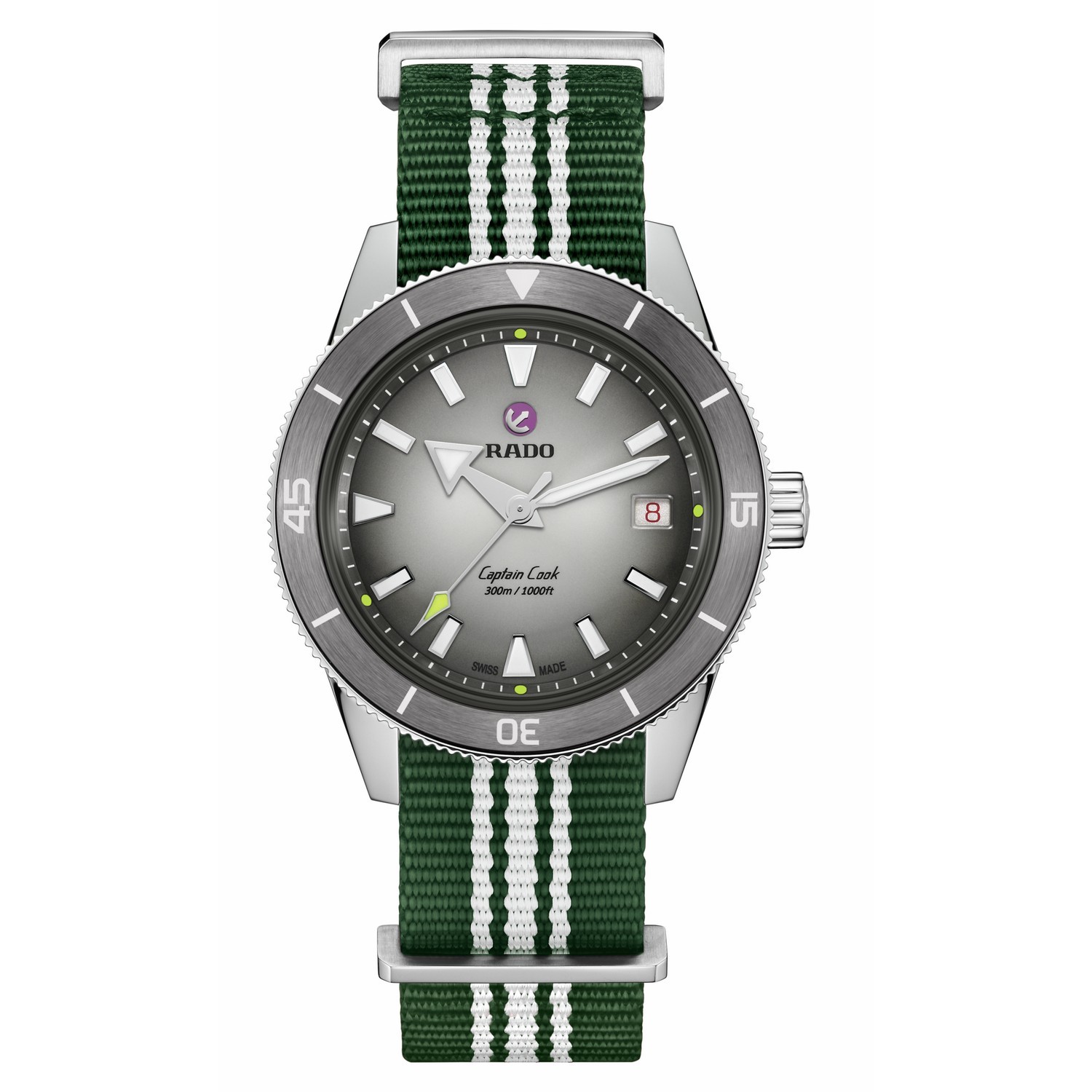 Zur Feier von 40 Jahren Tennispartnerschaft präsentiert Rado die Captain Cook x Tennis Limited Edition – eine Hommage an das erste grosse Sponsoring der Marke bei den Swiss Open 1985 in Gstaad. Die auf 1.985 Stück limitierte Uhr spiegelt das Vermächtnis von Präzision, Leistung und dauerhafter Verbundenheit mit dem Sport wider. Das 39-mm-Gehäuse aus poliertem Edelstahl ist mit einer drehbaren Lünette aus dem gleichen Material und einem Einsatz aus gebürsteter Plasmakeramik versehen, in den Ziffern, Markierungen und ein mit weissem Super-LumiNova® gefülltes Dreieck eingraviert sind. Das Saphirglas im Box-Shape-Stil – bei über 2.000 °C kristallisiert und beidseitig entspiegelt – bietet eine aussergewöhnlich klare und kratzfeste Oberfläche. Das Gehäuse ist bis zu 30 bar (300 Meter) wasserdicht und unterstreicht damit seine Eignung für eine hohe Beanspruchung. Das Herzstück dieser Uhr ist das Automatikwerk Kaliber R763. Es wurde für kompromisslose Zuverlässigkeit konzipiert. Das Uhrwerk mit 25 Lagersteinen wurde in fünf Positionen getestet und garantiert auch unter schwierigsten Bedingungen eine präzise Zeitmessung. Es ist mit einer antimagnetischen Nivachron™ Spiralfeder ausgestattet. Mit seiner robusten Gangreserve von 80 Stunden ist das R763 ein Beispiel für technische Exzellenz und mechanische Widerstandsfähigkeit – ein Ausdruck Schweizer Ingenieurskunst und des kontinuierlichen Strebens nach uhrmacherischer Perfektion. Das Zifferblatt mit einem Farbverlauf von Ruthenium zu Weiss ist ein reiner Ausdruck raffinierter Ästhetik. Die Stunden- und Minutenzeiger sowie die rhodiumfarbenen Indizes sind mit weissem Super-LumiNova® versehen, um auch bei schlechten Lichtverhältnissen eine optimale Ablesbarkeit zu gewährleisten. Die Datumsanzeige bei 3 Uhr und der ikonische rotierende Anker mit weinrotem Hintergrund unterstreichen die Liebe zum Detail des Zifferblatts. Ein rutheniumfarbener Zifferblattring umrandet das Zifferblatt, unterbrochen von gelben Super-LumiNova®-Punkten bei 3, 6, 8 und 12 Uhr – subtile Markierungen, die den 15, 30, 40 und Spielpunkten im Tennis entsprechen. Der Sekundenzeiger ist mit dunkelgelbem Super-LumiNova® versehen, das für eine bessere Sichtbarkeit und funktionale Eleganz sorgt. Ein Armband aus poliertem und satiniertem Edelstahl in Reiskorn-Optik rundet das Design ab und sitzt dank einer Dreifach-Faltschliesse aus Edelstahl sicher am Handgelenk. Die Uhr wird zudem mit drei zusätzlichen NATO-Textilarmbändern in Blau, Grün und Orange geliefert, die jeweils über eine Dornschliesse aus Edelstahl verfügen. Alle Armbänder sind mit dem EasyClip-System ausgestattet, das einen schnellen und werkzeuglosen Wechsel ermöglicht.