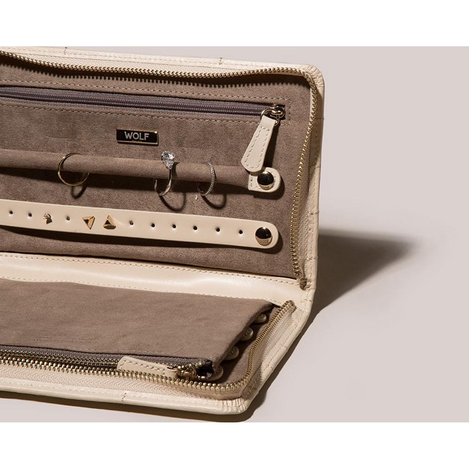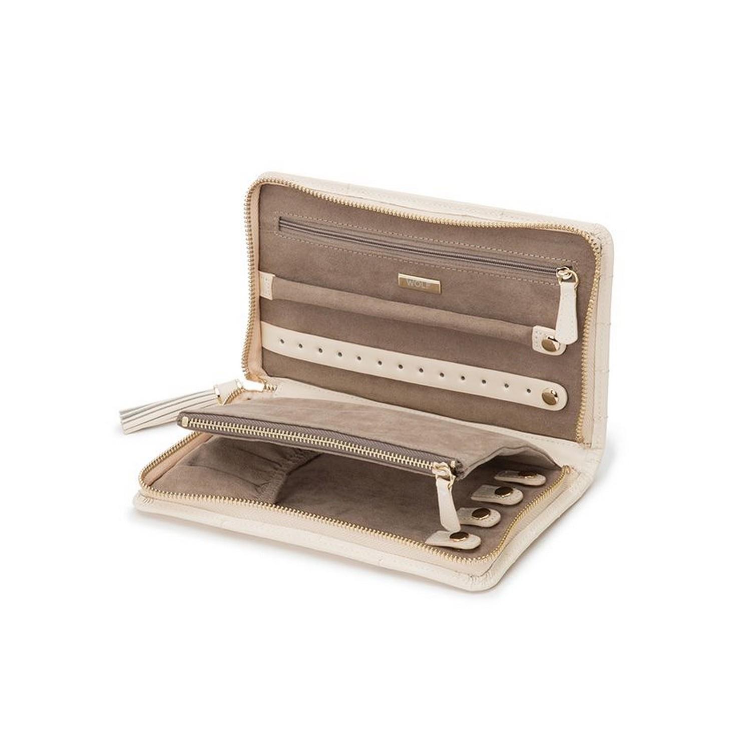 Die Verkörperung von Raffinesse und Stil. Caroline, ein zeitloser Klassiker mit eleganten, weichen Linien der 50er Jahre, geschmeidigem, diamantgestepptem Leder. Dieses edle Reiseetui mit vergoldetem Reißverschluss ist das perfekte Zuhause für Ihren kostbaren Schmuck und Accessoires. Reisen mit Caroline macht die sichere Aufbewahrung Ihres Schmucks unterwegs zum Kinderspiel.