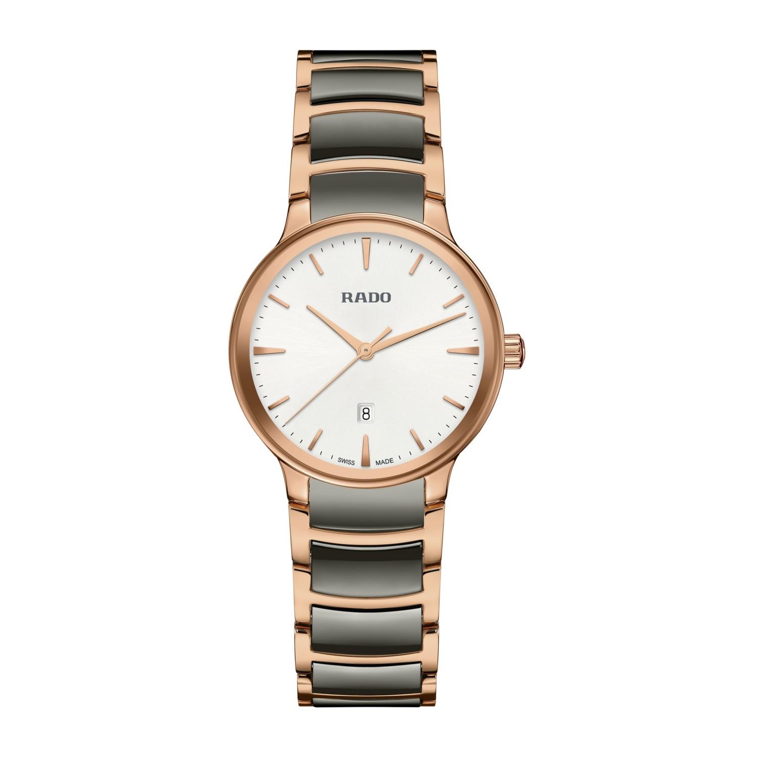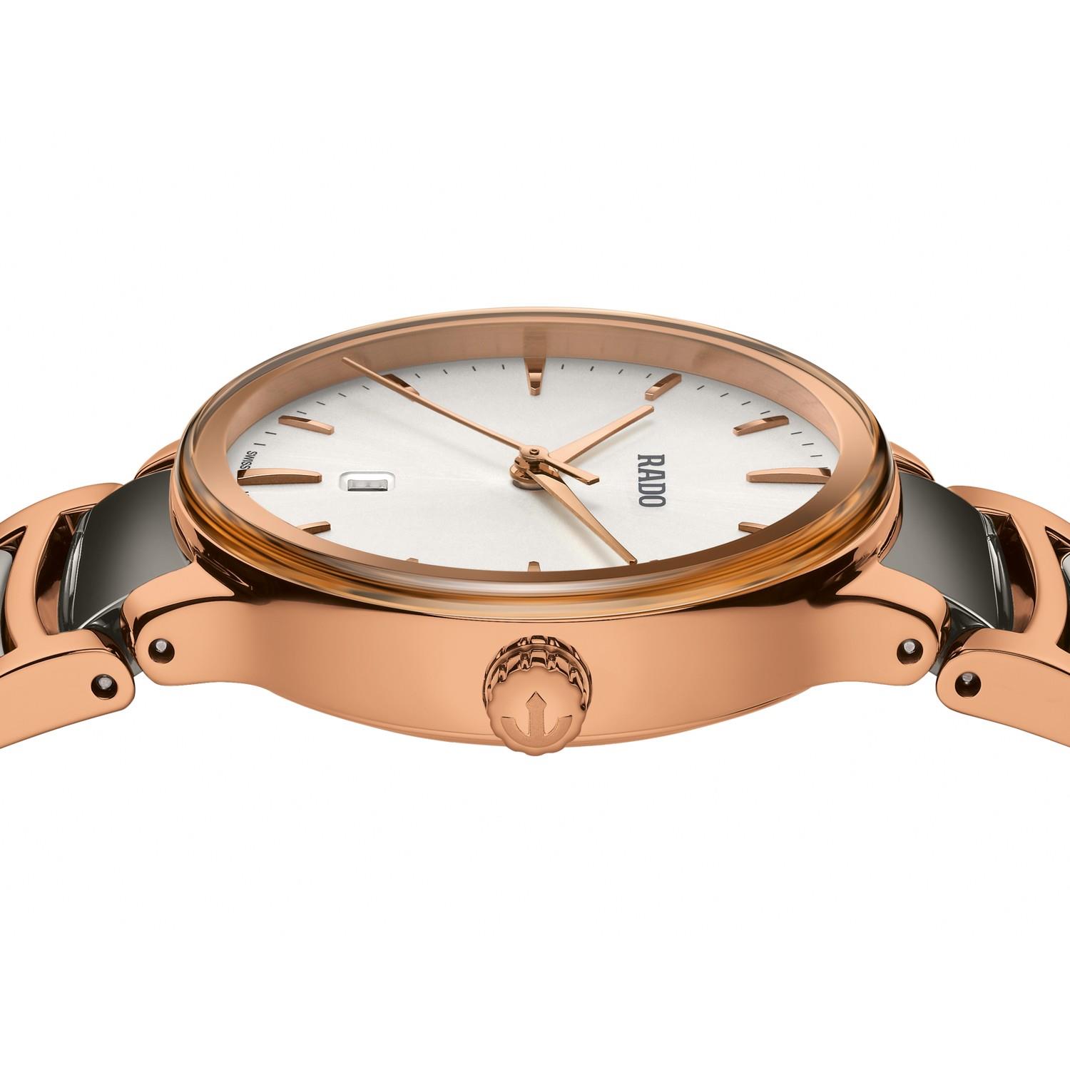 Die klassische Centrix Quartz wurde nicht nur technisch, sondern auch ästhetisch überarbeitet. Beim neuen Modell reicht das gewölbte Saphirglas bis hin zum Rand und scheint nahtlos in das sanft gerundete Gehäuse überzugehen. Die Gesamtoptik dieses ikonischen Zeitmessers wird durch überarbeitete Bandanstösse am Gehäuse und ein Armband aus poliertem roségoldfarbenem Edelstahl mit PVD-Beschichtung und Mittelgliedern aus Plasma-Hightech-Keramik abgerundet. Das silberfarbene Zifferblatt mit Sonnenschliff und roségoldfarbenen applizierten Indizes ist perfekt auf die roségoldfarbenen Zeiger abgestimmt. Dank der PreciDrive- und HeavyDrive-Technologie im R079 Quarzwerk zeichnet sich die Uhr durch eine grössere Genauigkeit und Stossfestigkeit aus. Die Uhr ist bis zu einer Tiefe von 50 m wasserdicht.