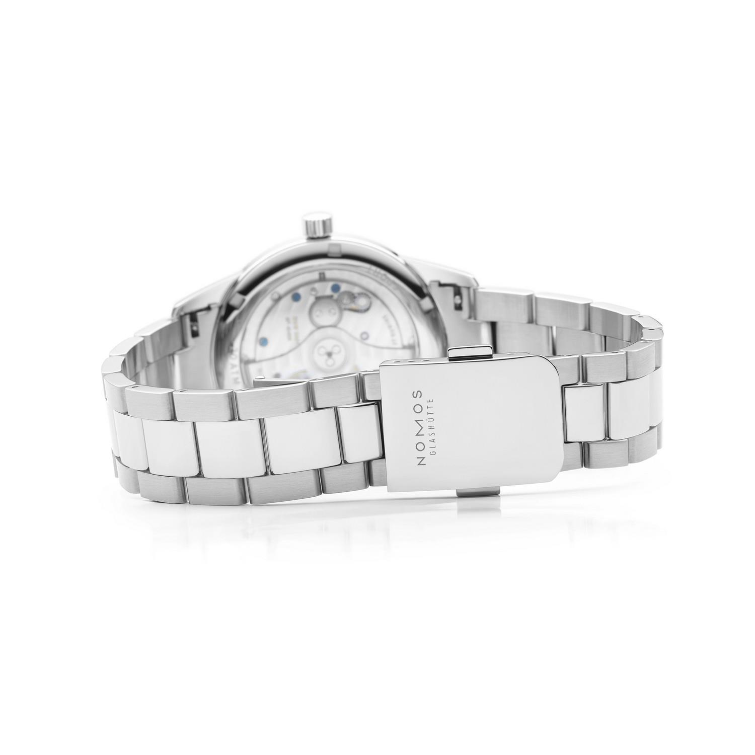 Neu in der Serie Campus: Automatikuhren, die Studium, Promotion, das Leben begleiten. Etwa Club Campus neomatik, mit 37 Millimetern Durchmesser das kleinste der drei neuen Modelle. Auch bei dieser Uhr zeigen arabische und römische Ziffern zugleich die Zeit an. Eine Premiere bei NOMOS Glashütte: das Metallband, das diese Uhr noch außergewöhnlicher erscheinen lässt.