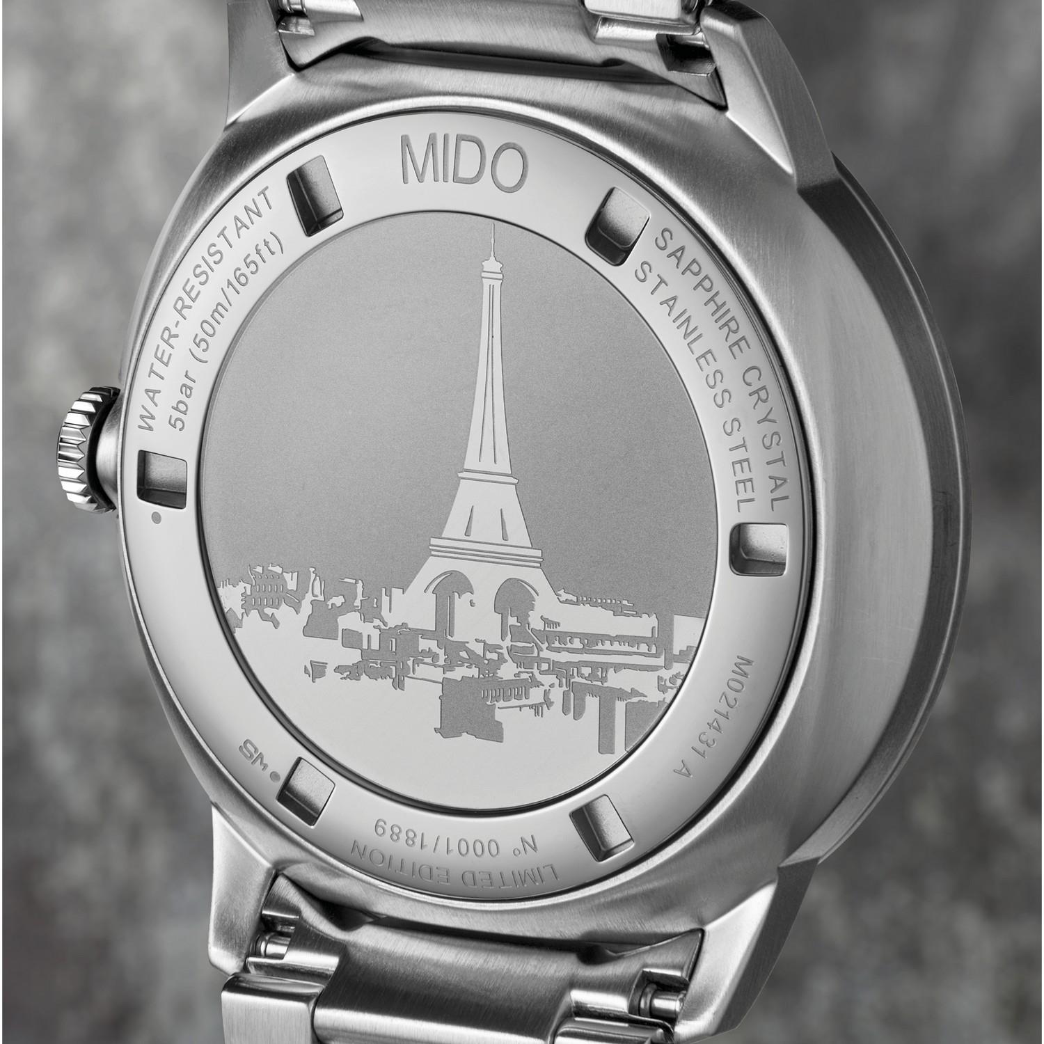 2022 feierte Mido 20 Jahre architektonische Inspiration: mit fünf limitierten Uhrenmodellen als Hommage an seine wichtigsten Kollektionen, die von beeindruckenden Bauwerken inspiriert sind. Die Jubiläumsedition der Commander – aus Edelstahl mit anthrazitfarbenem Zifferblatt mit Sonnenschliff und hellbrauner Super-LumiNova® – stellt das letzte Kapitel dieser Jubiläumsreise dar. Zeitlose Linien und stilistische Anspielungen erinnern an den Eiffelturm. Die legendäre Commander-Kollektion fordert die Zeit heraus. Limitiert ist diese erlesene Uhr auf 1.889 Exemplare – die Zahl entspricht dem Jahr, in dem die „eiserne Dame von Paris“ eingeweiht wurde. Mit ihrem Kaliber 80 Si ist sie ein höchst präziser und zuverlässiger Zeitmesser. Das Uhrwerk ist mit einer Hightech-Spiralfeder aus Silizium ausgestattet und von der Offiziellen Schweizer Kontrollstelle für Chronometer (COSC) als Chronometer zertifiziert. Diese exklusive Serie wird in einer besonderen Schatulle mit einer Gedenkmünze und einem individuellen Zertifikat über die limitierte Auflage angeboten.
