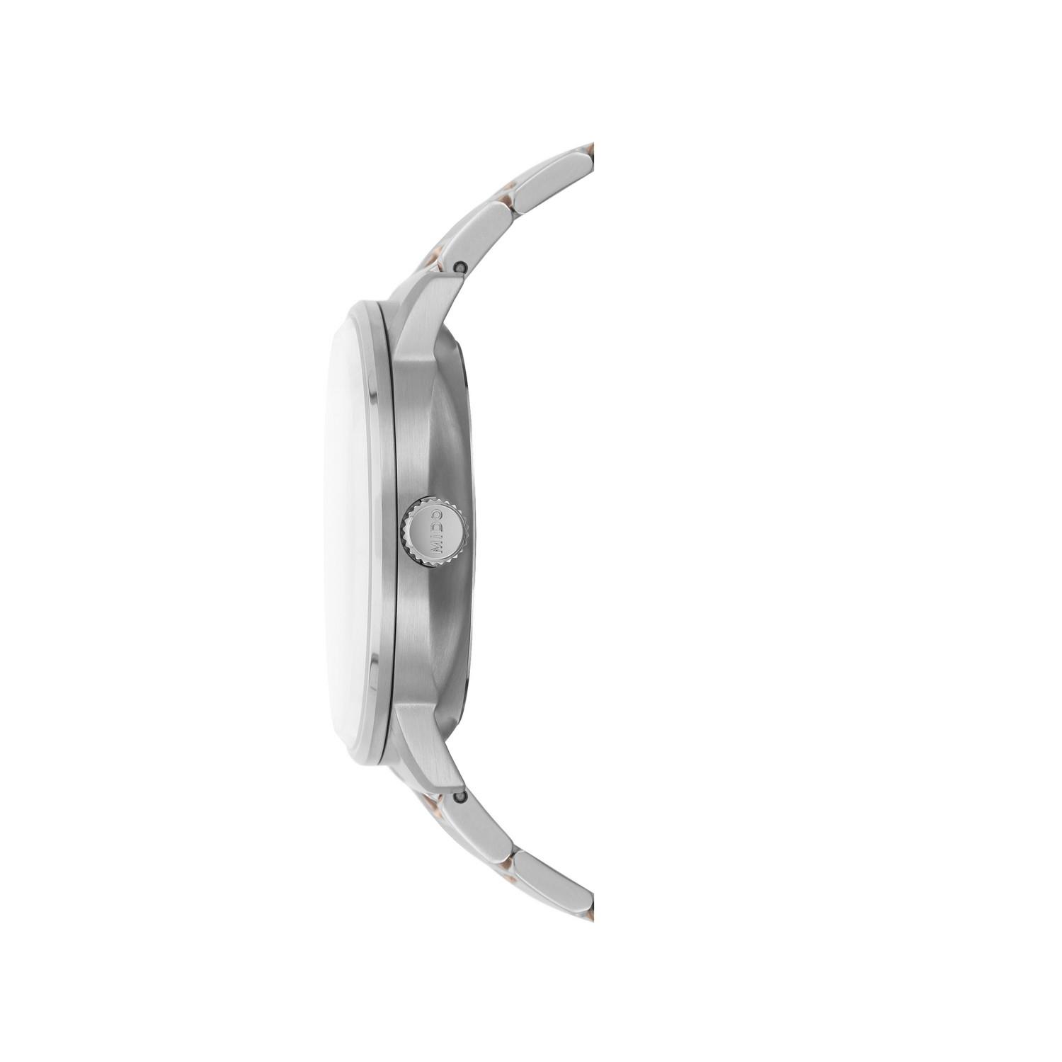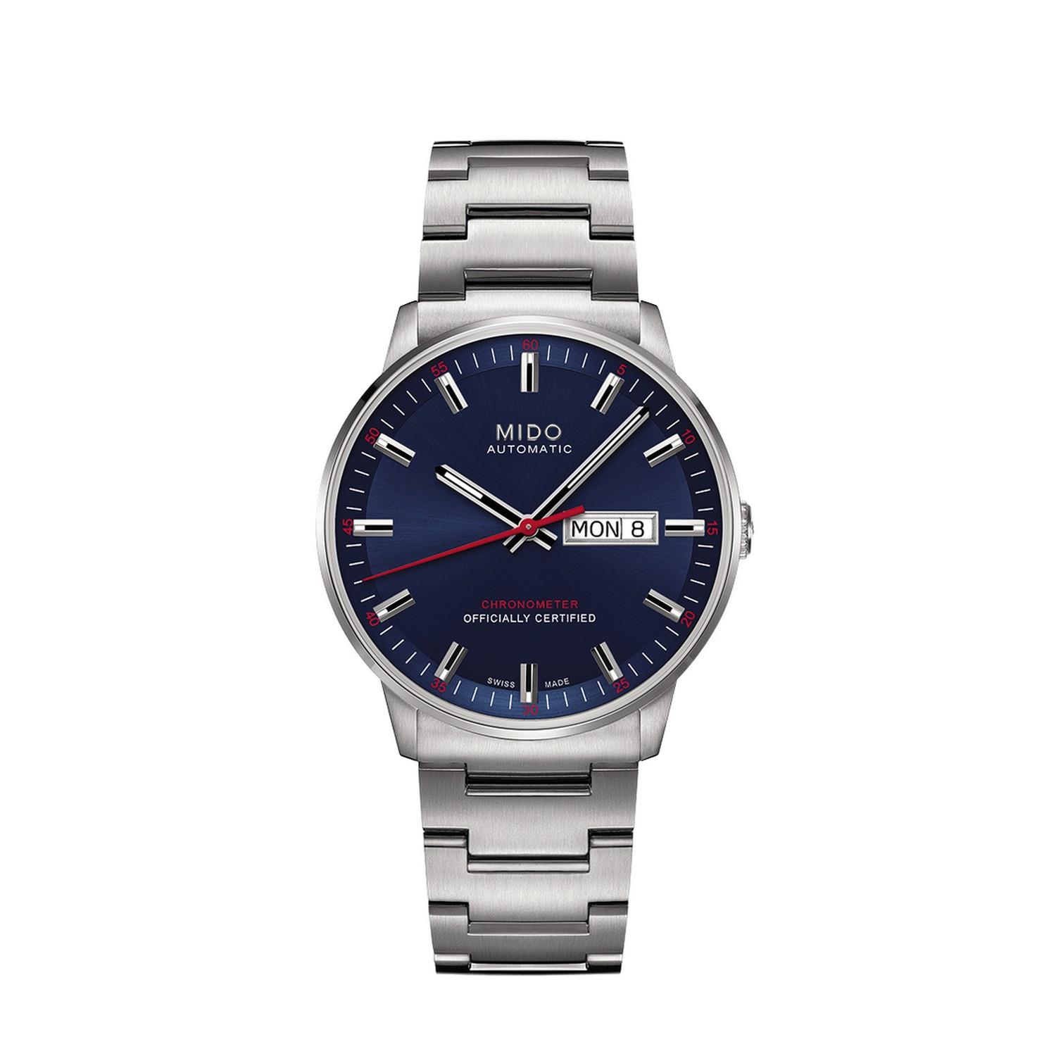 Diese Commander-Uhr erweitert den legendären Zeitmesser um moderne Merkmale. Auf dem Zifferblatt unter dem angeschrägten Saphirglas prangt das aktuelle MIDO-Logo und das Automatikwerk der Uhr ist als Chronometer zertifiziert.