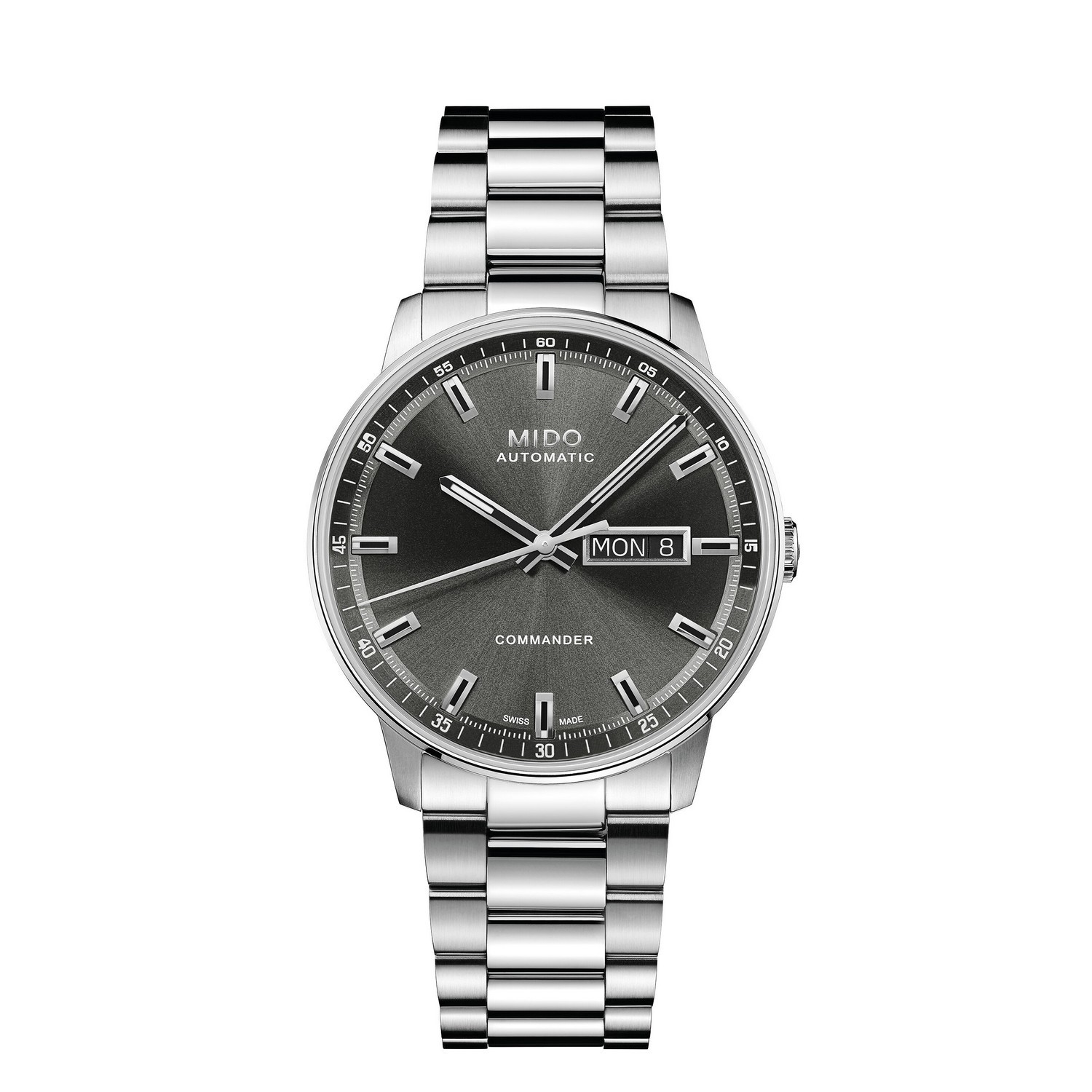 Die Commander Datoday verkörpert voll und ganz den Geist von MIDO. Ihr satiniertes Zifferblatt mit abgestuftem Flansch sowie die neu gestalteten, mit Super-LumiNova® gefüllten Zeiger und Indexe umrahmen die charakteristische Datumsanzeige. Die integrierte Krone, das satinierte und polierte Edelstahlgehäuse in der emblematischen Form der Commander, das gläserne Saphirglas und das mit einem Schnellwechselsystem ausgestattete Edelstahlarmband verbinden zeitlose Eleganz mit moderner Präzision. Eine zeitgemäße Neuinterpretation des ikonischen Designs der Commander, die auf mehr als sechs Jahrzehnte Tradition zurückblicken kann.