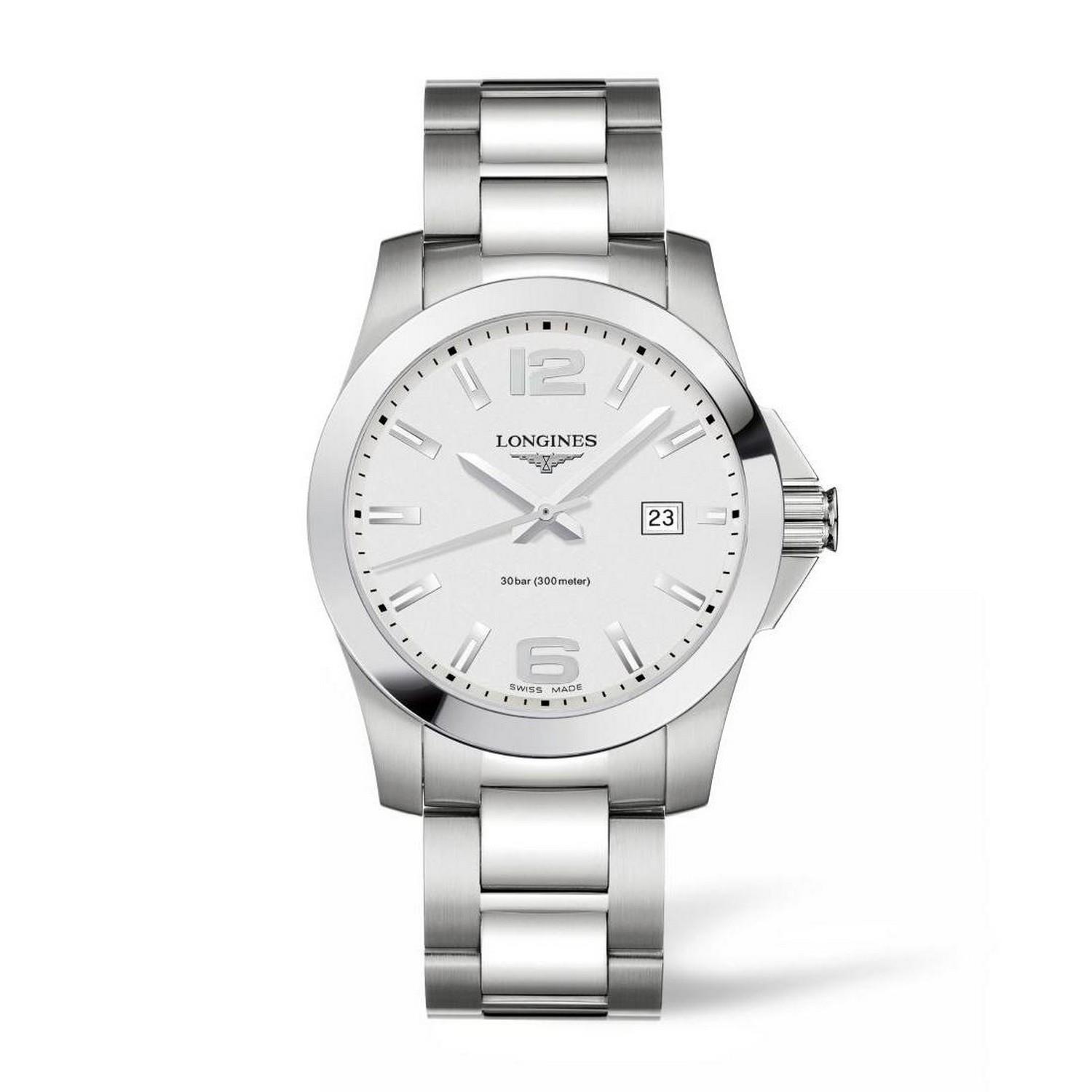 Die Longines Conquest verkörpert auf vollendete Weise die sportliche Eleganz der Marke. Besondere Aufmerksamkeit wurde dem ästhetischen Potenzial des Glasdeckels, der Krone mit Deckglas und den aus Keramik gefertigten Armbandgliedern gewidmet. Dieses außergewöhnliche Material verbindet zeitlosen Glamour mit nicht alltäglichen technischen Eigenschaften. Mit ihrer subtilen Verbindung von Edelstahl und Keramik sowie von Leistung und Eleganz bietet die Longines Conquest sämtliche technischen Eigenschaften, die den Bedürfnissen der anspruchsvollsten Sportler gerecht werden. Sie ist sowohl dezent als auch raffiniert, und sie wird bei mondänsten Abendgesellschaften als auch auf den Tribünen prestigeträchtiger Pferderennen auffallen.