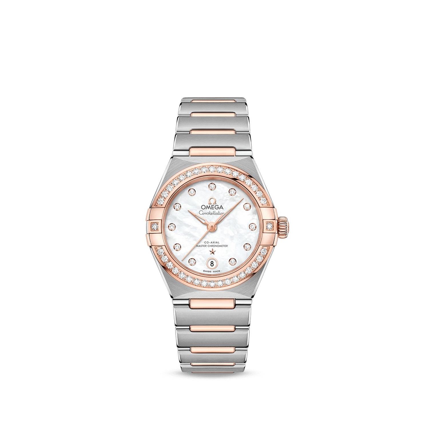 Dieses 29 mm große Modell in 18 K Sedna™-Gold und Edelstahl verfügt über eine diamantbesetzte Lünette, ein perlfarbenes Perlmuttzifferblatt mit Diamantstundenmarkierungen und ein Datumsfenster bei 6 Uhr. Die Zeiger, das OMEGA Logo, der Constellation-Stern und die Diamantfassungen sind ebenfalls aus 18 K Sedna™-Gold.