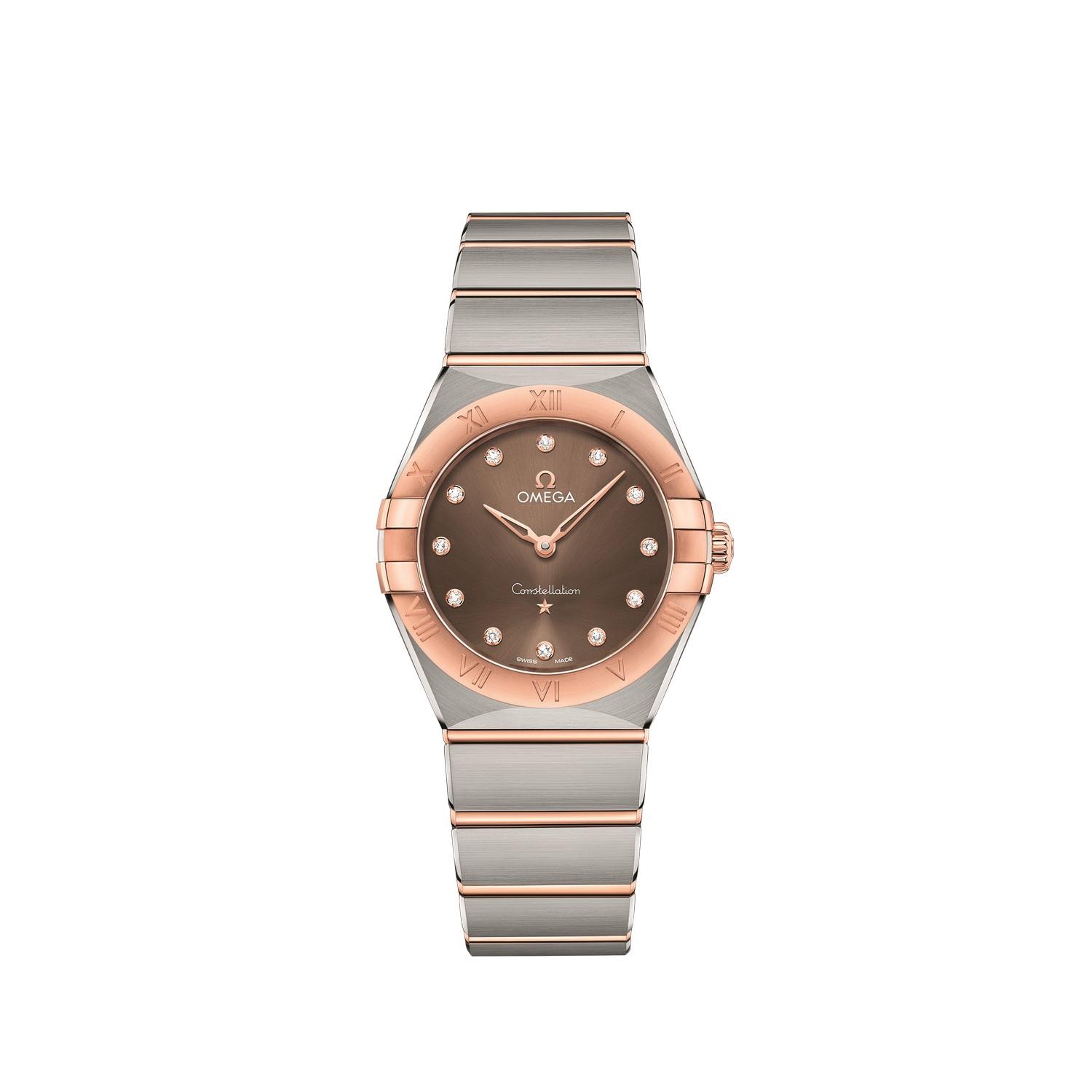 Dieses 28 mm große Modell in 18 K Sedna™-Gold und Edelstahl verfügt über eine mit römischen Ziffern gravierte Lünette, ein braunes Zifferblatt mit Sonnenschliff und Diamantstundenmarkierungen sowie ein kratzresistentes Saphirglas. Die Zeiger, das OMEGA Logo, der Constellation-Stern und die Diamantfassungen sind ebenfalls aus 18 K Sedna™-Gold.