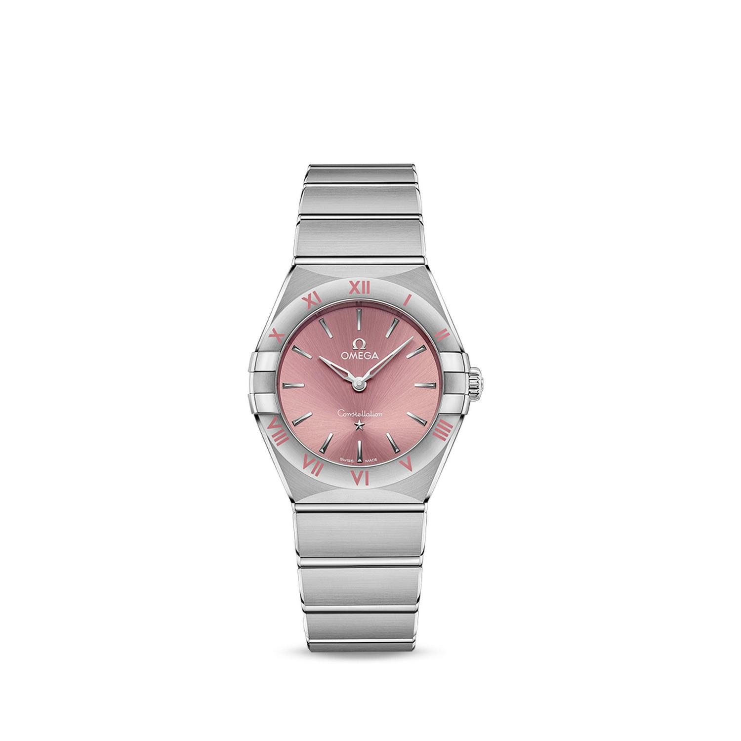 Dieses 28-mm-Modell mit Gehäuse und Armband aus Edelstahl ist mit Indizes und applizierten Elementen aus 18 K Weißgold auf einem leuchtend rosafarbenen Zifferblatt versehen.