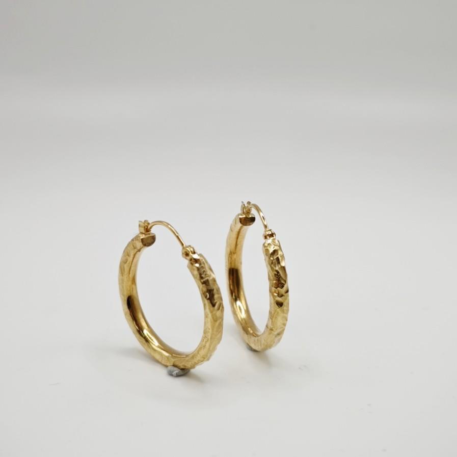 Zwei Kreise liegen ineinander, berühren sich aber nicht. Zwischen ihnen entsteht ein Kanal, der mit jedem Hintergrund gefüllt wird. Polierte und mattierte Oberflächen wechseln sich hier ab und machen diese Ohrringe noch spannender. Aus jeder Blickrichtung ergibt sich ein neues Bild. So werden „normale“ Creolen zu etwas ausgefallenem.
