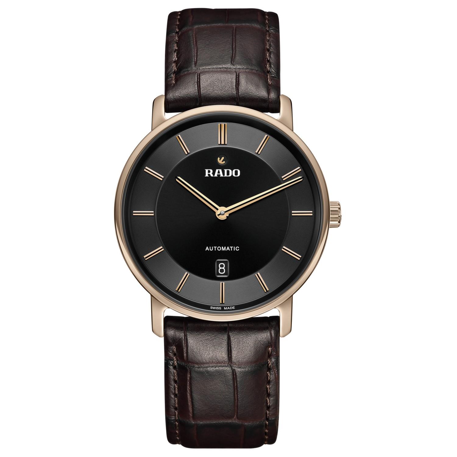 Wir stellen vor: die Rado DiaMaster Thinline Automatic Bei diesem von einem Rado Automatikwerk R766 angetriebenen Modell werden Tradition und Innovation nahtlos miteinander vereint. Dank einer beeindruckenden Gangreserve von 72 Stunden verfügt diese Uhr zudem über eine garantiert lange Laufzeit. Das 41 mm grosse Gehäuse der DiaMaster Thinline Automatic aus poliertem, roségoldfarbenem Ceramos™ zeichnet sich durch seine äusserst solide Monobloc-Konstruktion aus. Der aufgepresste Gehäuseboden aus Titan ist mit einem Saphirglas ausgestattet und sorgt damit für einen Hauch von Raffinesse. Das schwarze Zifferblatt – akzentuiert mit roségoldfarbenen applizierten Indizes mit schwarzer Einlage – bezaubert mit seinem Wechselspiel aus Licht und Schatten. Für eine ausgezeichnete Lesbarkeit sorgen die roségoldfarbenen Zeiger, ebenfalls mit schwarzer Einlage. Gleichzeitig verleihen die Zeiger dem Modell einen Hauch von Luxus. Abgerundet wird das Ensemble durch ein braunes Lederarmband mit einer Schliessenabdeckung aus roségoldfarbenem Ceramos™, das sowohl Raffinesse als auch Komfort ausstrahlt.