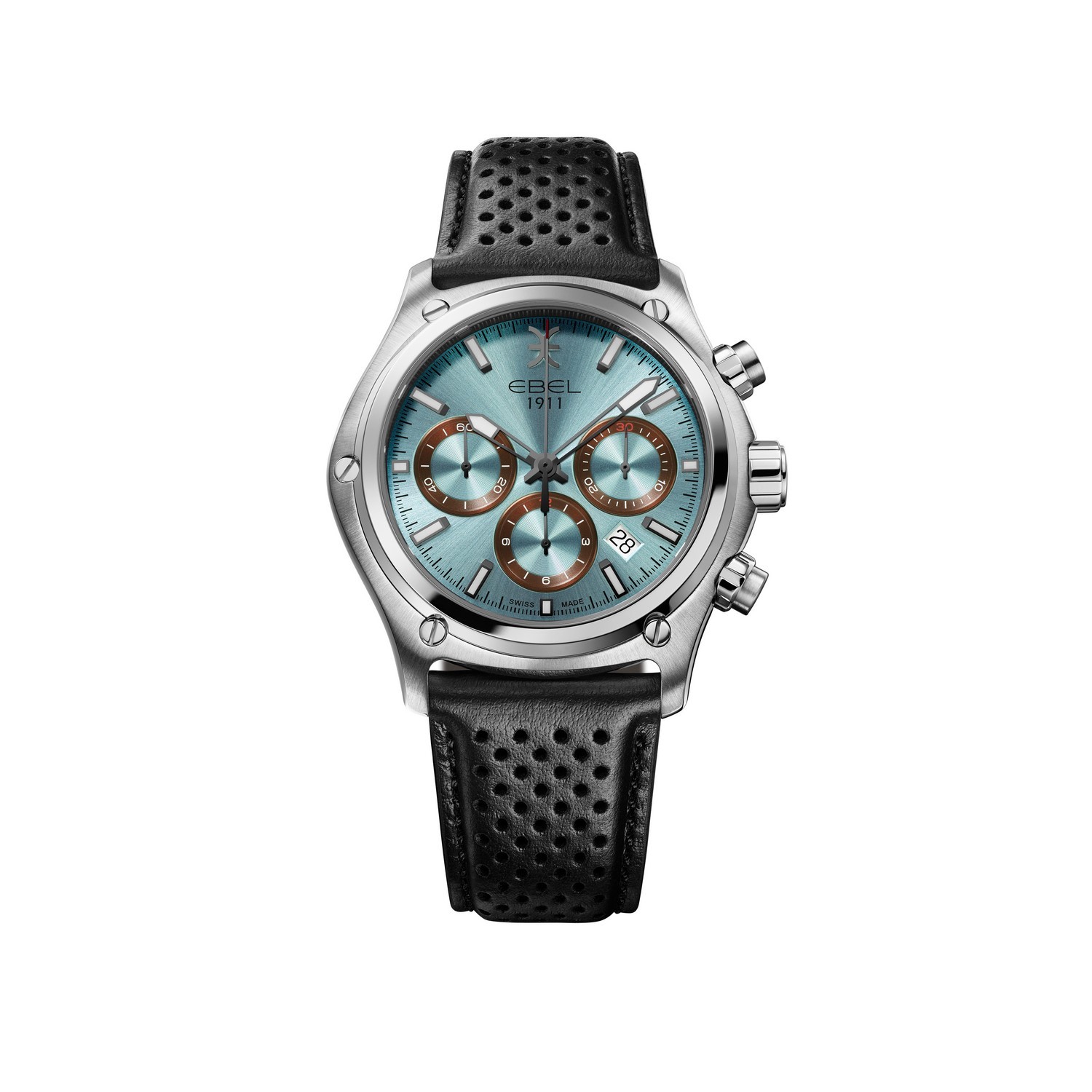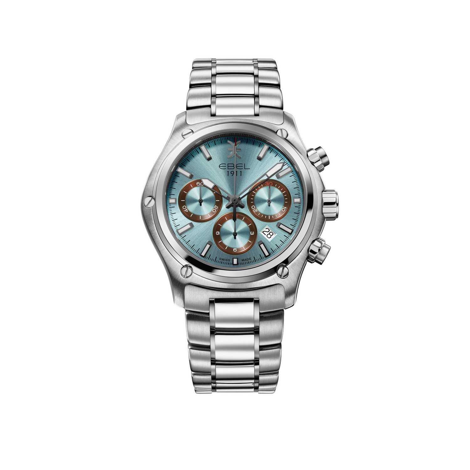 EBEL 1911 Herrenuhr, Gehäuse aus Edelstahl, Ø 44 mm, eisblau galvanisiertes Zifferblatt mit applizierten Super-LumiNova® Indizes, Datumsfenster auf 4:30 Uhr, innenseitig entspiegeltes Saphirglas, Gehäuserückseite aus Saphirglas, Armband aus Edelstahl, Faltschließe, zusätzliches schwarzes Kalbslederband, Schweizer Automatik-Chronographenwerk, wasserdicht bis 10 bar