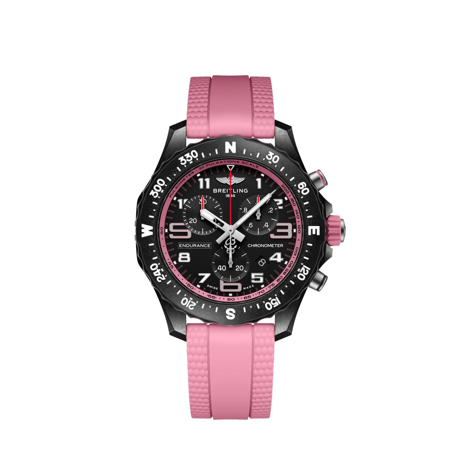 Die Endurance Pro ist als besonders leichter Wettkampfzeitmesser, aber auch als lässiger Sportchronometer für jeden Tag konzipiert. Sie repräsentiert die perfekte Verschmelzung von innovativer Technologie und frischem Design und ist damit die ultimative Athleisure-Uhr. Die Endurance Pro wurde für Frauen und Männer gestaltet, in deren aktivem Leben Professionalität und Sportlichkeit zusammenfinden. Sie ist den Herausforderungen eines anstrengenden Workouts gewachsen, ist aber auch ein stilvoller Begleiter im Alltag. Die Endurance Pro verfügt über ein ultraleichtes Gehäuse aus Breitlight®. Dieser widerstandsfähige Werkstoff ist 3,3-mal leichter als Titan und 5,8-mal leichter als Edelstahl. Das antimagnetische, thermisch stabile und hypoallergene Breitlight® ist hochgradig kratz-, zug- und korrosionsfest. Die haptische Wirkung ist wärmer als die von Metall; der leichte Textureffekt unterstreicht den Einfallsreichtum des Designs. Das Material ist zu 100 % Swiss-made und nur bei Breitling erhältlich. Neben einem Durchmesser von 44 mm oder 38 mm haben Athleten bei der Endurance Pro ausserdem die Wahl zwischen zahlreichen farbenfrohen Zifferblättern und Kautschukarmbändern mit der Breitlight®-Dornschliesse. Beide Grössen werden vom Breitling-Kaliber 82 bzw. 83 angetrieben. Diese COSC-zertifizierten SuperQuartz™-Chronographen zeichnen sich durch eine aussergewöhnliche Ganggenauigkeit aus.