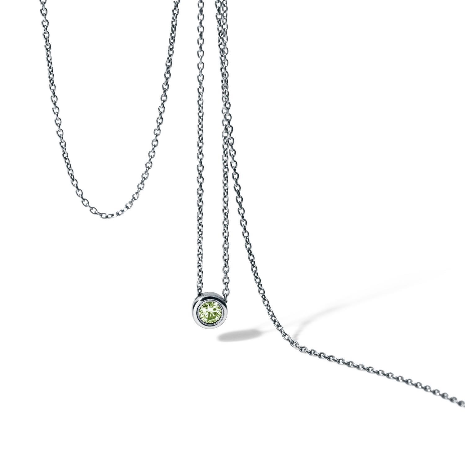 Die Humphrey Peridotkette aus Edelstahl ist ein zartes und glanzvolles Highlight am Hals seiner Trägerin.