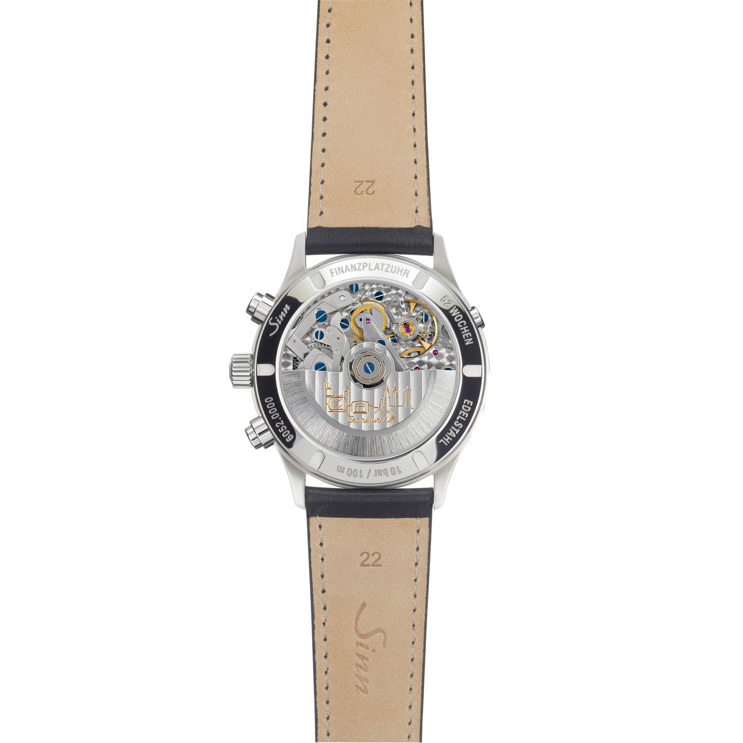 Jede Frankfurter Finanzplatzuhr darf für sich in Anspruch nehmen, mit spezifischen Ausstattungsmerkmalen aufzuwarten. So auch das Modell 6052. Denn der klassische Chronograph zeichnet sich durch eine nützliche Anzeige der Kalenderwoche aus. Hierbei handelt es sich um eine besondere Funktion, die zum ersten Mal bei einer SINN-Uhr zum Einsatz kommt. Zusätzlich zur Kalenderwoche lassen sich auf dem Zifferblatt Wochentag und Monat ablesen. Die 6052 ist damit die ideale Uhr, um im Geschäftsleben Termine zu koordinieren und Aktivitäten zu planen – ohne einen Kalender zur Hand haben zu müssen. Ermöglicht wird diese Funktionalität durch das SZ03, einer von Sinn Spezialuhren entwickelten und umgesetzten Uhrwerkmodifikation.
