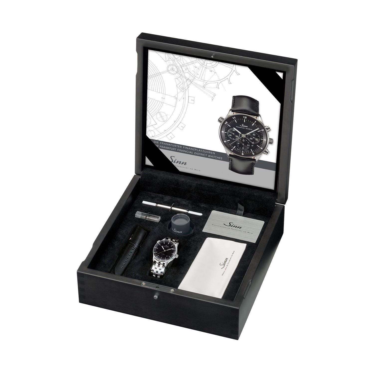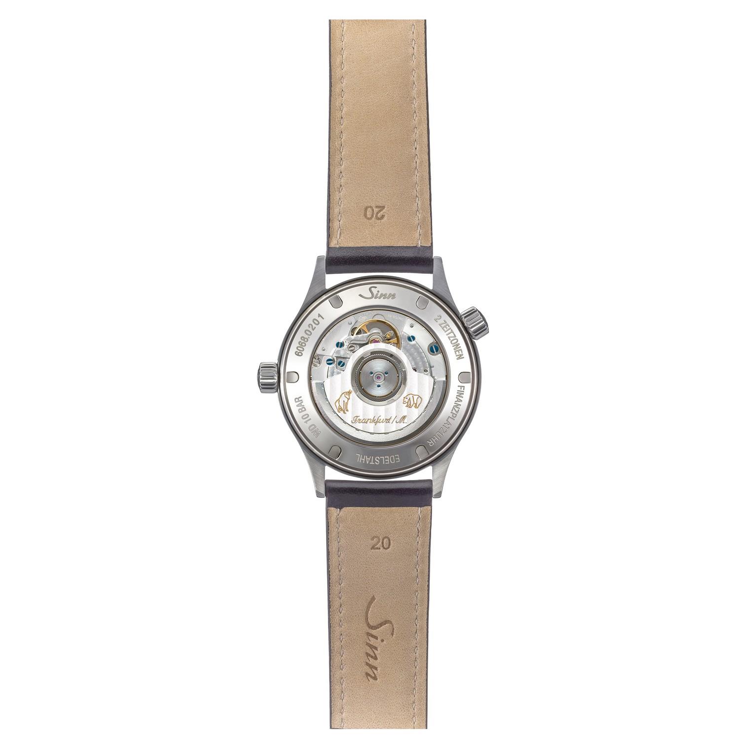Die Frankfurter Finanzplatzuhr Modell 6068 bildet eine gelungene Verbindung aus Ästhetik und Funktionalität, die durch Klarheit und Übersichtlichkeit besticht. Damit reiht sich diese Uhr nahtlos ein in die beliebte Modellreihe, die seit ihrer Präsentation im Jahre 1999 auch über die Stadtgrenzen hinaus viele Uhrenfreunde gefunden hat. Mit ihren Ausstattungsmerkmalen knüpft sie an bewährte technische Details der Modellreihe an. So ermöglicht das Modell 6068 die Anzeige von zwei Zeitzonen auf 12-Stunden-Basis. Das Gehäuse besteht aus poliertem Edelstahl und fasst das schwarze Zifferblatt mit Sonnenschliff ein. Die aufgesetzten Appliken sind mit Leuchtfarbe belegt, ebenso Stunden- und Minutenzeiger. Das Deckglas besteht aus beidseitig entspiegeltem Saphirkristall. Durch den Sichtboden aus innen entspiegeltem Saphirkristallglas lässt sich das veredelte Uhrwerk mit der Rotorgravur „Bulle und Bär“ betrachten. Die 6068 ist zudem wasserfest bis 10 bar und unterdrucksicher.