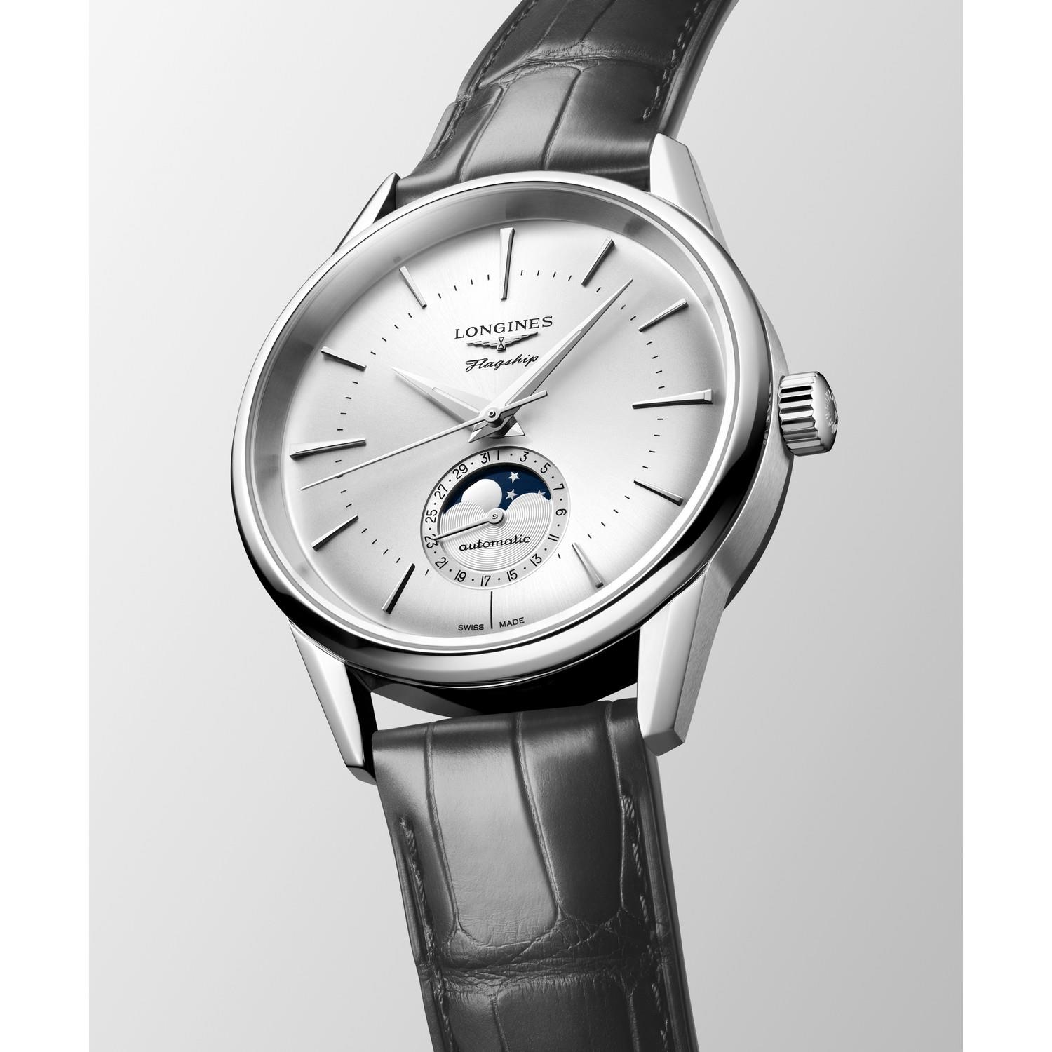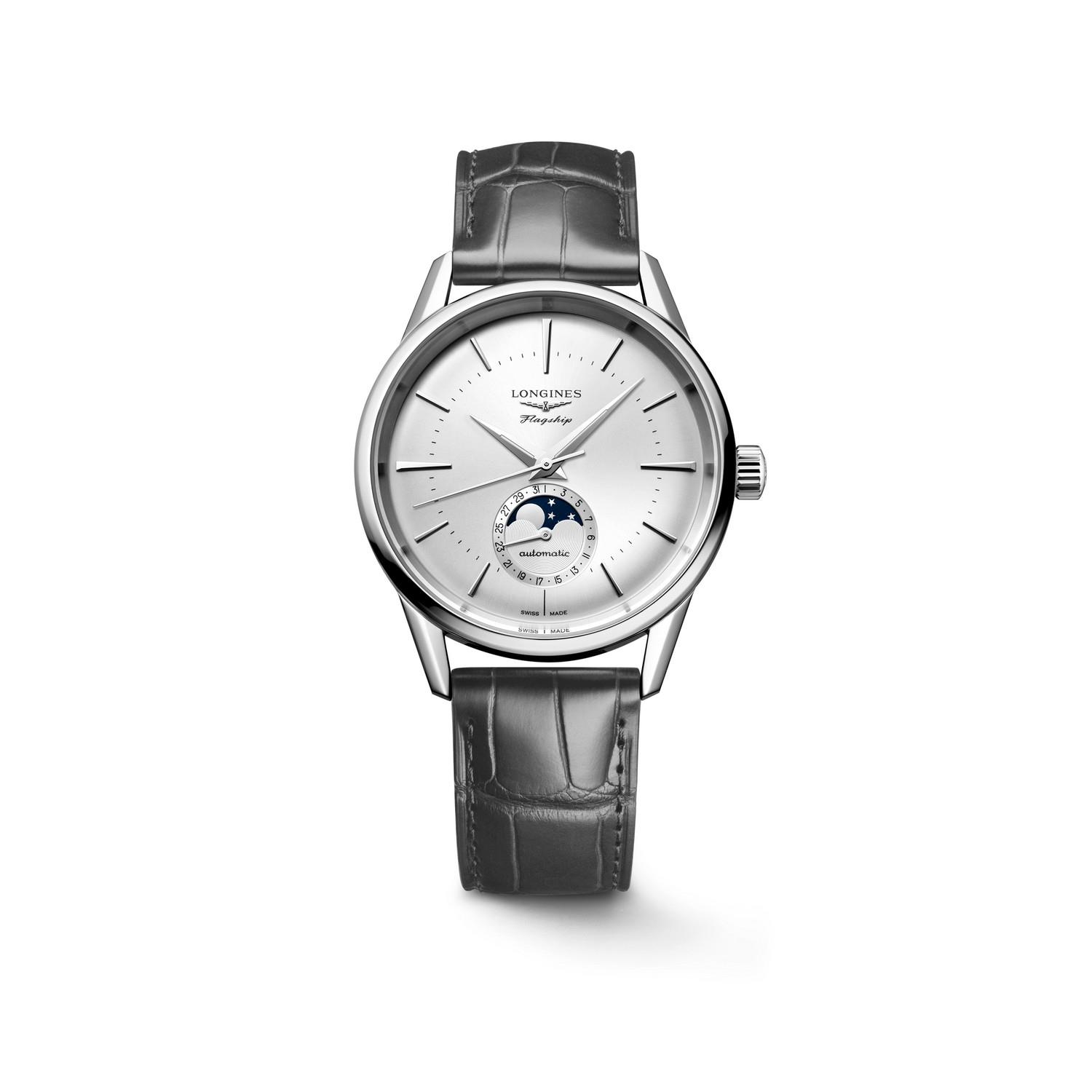 Die Flagship Heritage Linie wird um neue Varianten mit Mondphasenkomplikation erweitert. Sie befindet sich auf einem Hilfszifferblatt mit Zeigerdatum, das bei 6 Uhr platziert ist. Ihr Uhrwerk, das exklusiv bei Longines zum Einsatz kommt, ist magnetresistent und mit einer Spiralfeder aus Silizium ausgestattet. Das Edelstahlgehäuse mit verschraubtem Boden hat einen Durchmesser von 38.5 mm. Es ist satiniert und gebürstet, mit verkürzten und abgeschrägten Bandanstössen.