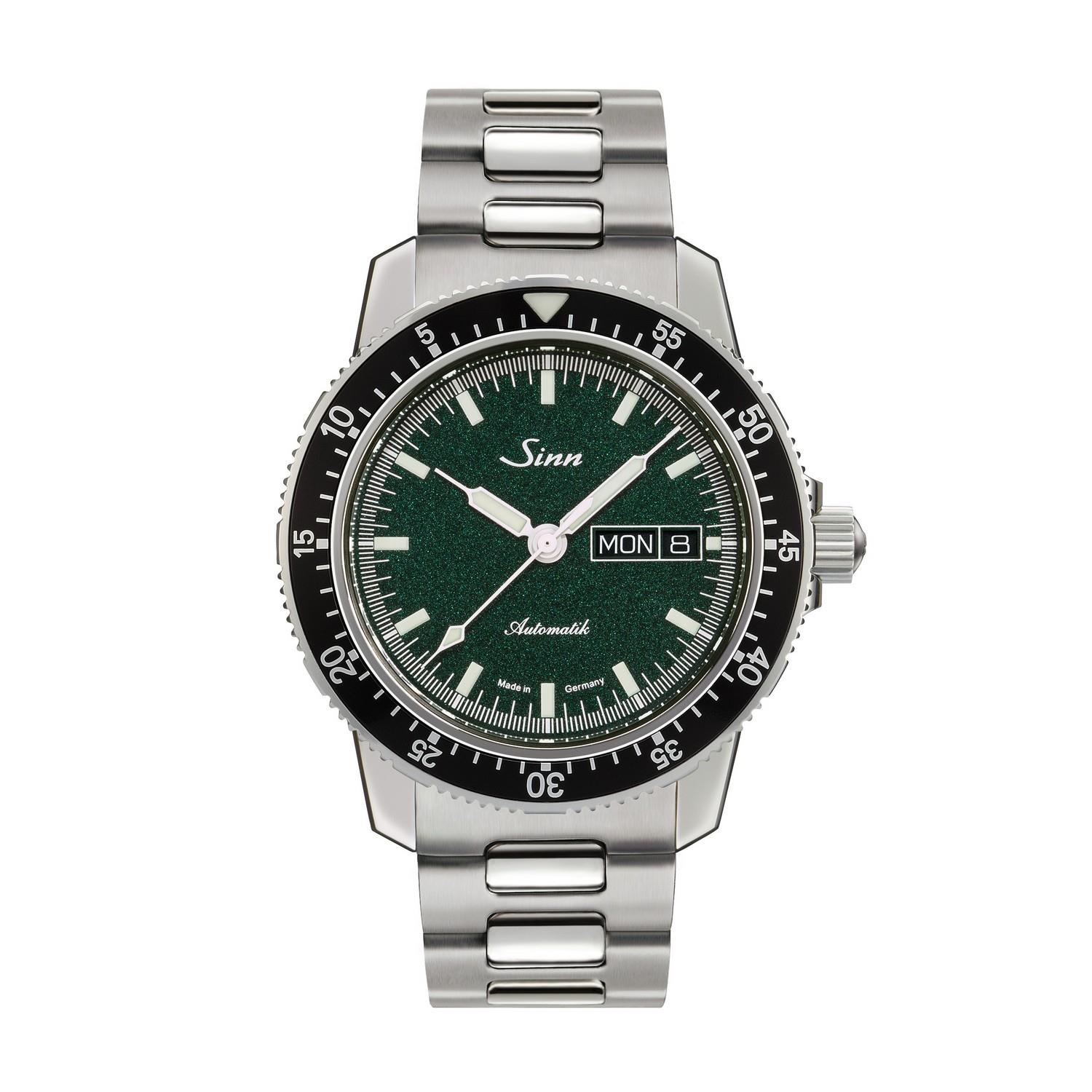 Als farbliche Besonderheit haben wir für dieses Modell ein metallisch grün schimmerndes Zifferblatt gewählt. Ausgestattet ist die instrumentelle Uhr mit einem polierten Gehäuse aus Edelstahl. Deck- und Bodenglas bestehen aus Saphirkristall, sodass sich die präzise Arbeit des mechanischen Werkes genauestens beobachten lässt. Der beidseitig drehbare, in Minutenschritten rastende Fliegerdrehring ist unverlierbar mit dem Gehäuse verbunden. Als Hauptmarkierung trägt er ein nachleuchtendes Dreieck.