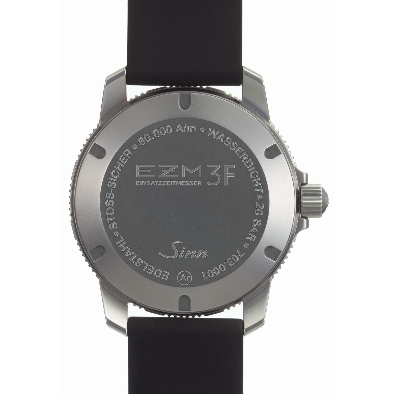 Der EZM 3F ist eine klassische Fliegeruhr, ausgestattet mit einem rückwärts zählenden Fliegerdrehring mit Minutenrastung. Zwecks besserer Ablesbarkeit trägt der Drehring als markante Hauptmarkierung ein nachleuchtendes Dreieck bei 12 Uhr. Er ist in beide Richtungen drehbar. Auffallend ist weiterhin die Anordnung der Krone auf der linken Seite des perlgestrahlten Gehäuses. Diese Anordnung gewährleistet mehr Bewegungsfreiheit und verschafft der Krone eine besonders geschützte Position. Ausgestattet ist diese instrumentelle Uhr mit der Ar-Trockenhaltetechnik für eine erhöhte Funktions- und Beschlagsicherheit, einem Magnetfeldschutz bis 80.000 A/m und der Temperaturresistenztechnologie, die für Funktionssicherheit im Temperaturbereich von –45°C bis + 80°C sorgt.