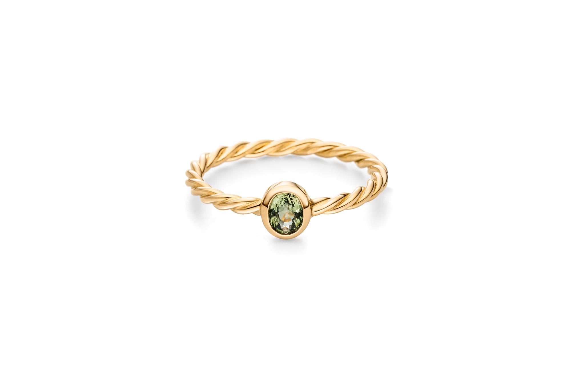 EIN OVALER DEMANTOID WIRD EINGERAHMT VON EINER GELBGOLDENEN ZARGENFASSUNG.