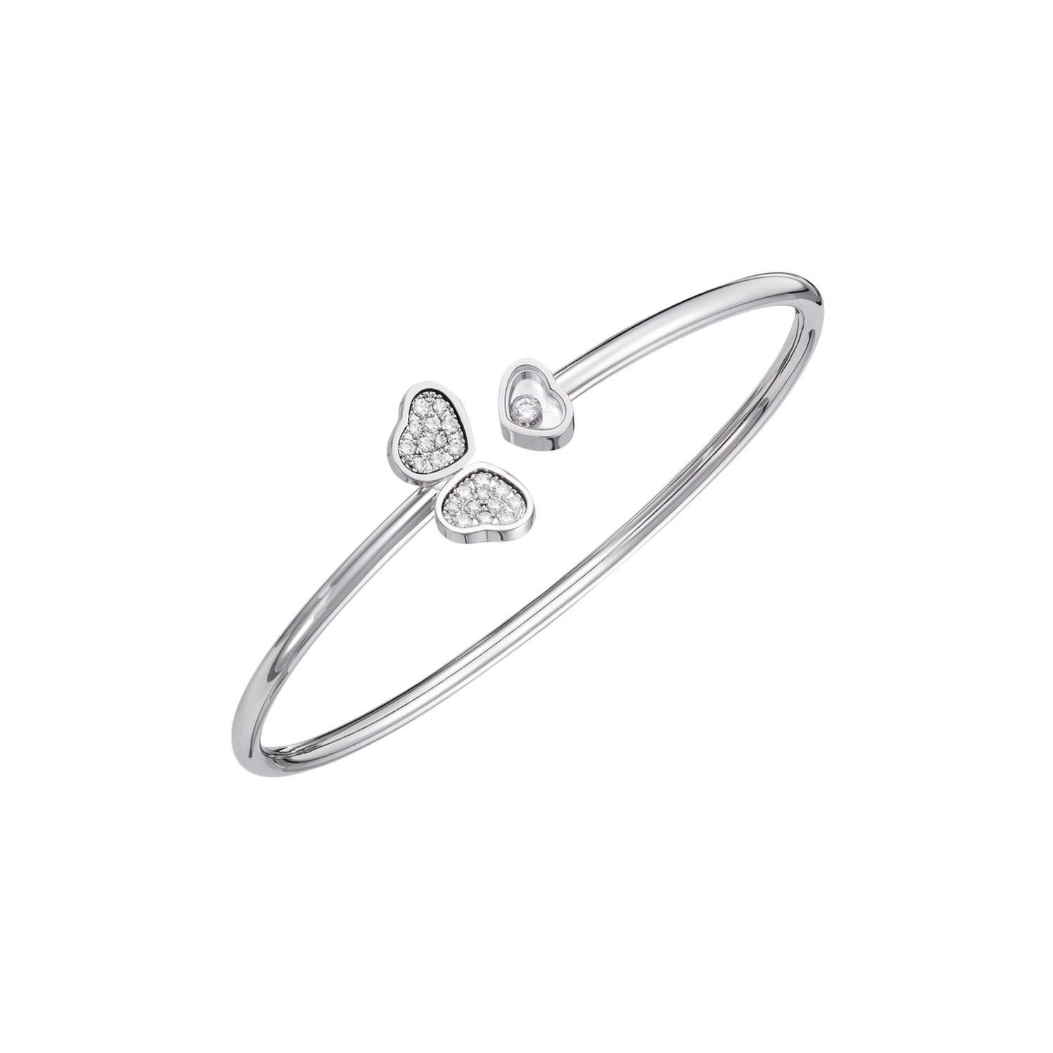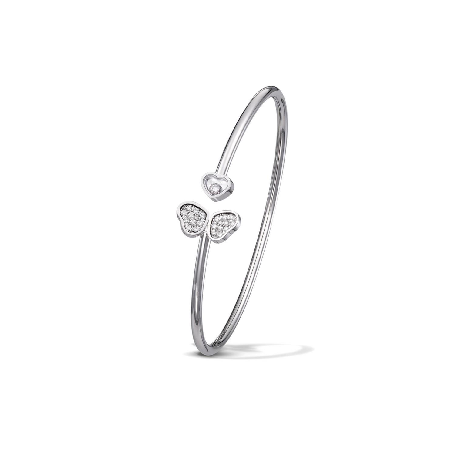 Zwei diamantbesetzte Herzen, die wie Schmetterlingsflügel arrangiert sind, schweben unter einem Herz mit einem tanzenden Diamanten. Die Umrisse der Flügel malen ein Herz in die Luft. Kreationen von Happy Hearts Wings sind Glücksbringer, die man direkt auf der Haut trägt. Little Diamonds Do Great Things