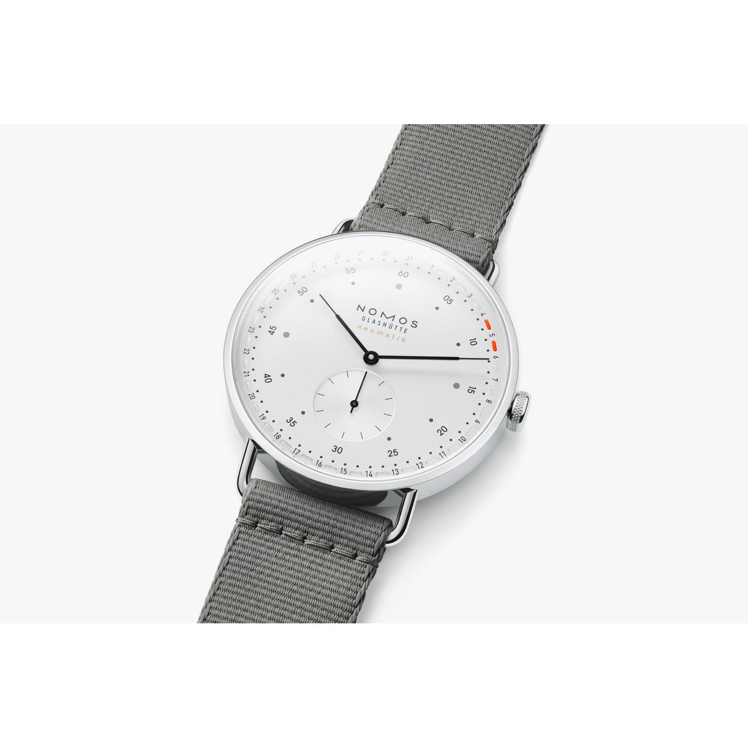 Großstädtisch, weltgewandt und smart – das ist Metro. Auch als Metro neomatik 41 Update liebt diese Uhr klare Formen. Das einzigartige, patentierte NOMOS-Ringdatum in Neonorange verweist auf eine neue Zeit – die schöne Gestaltung von Metro bleibt dennoch unverkennbar Metro. Das dunkelgraue Textilband gibt diesem jüngsten Modell, das in Zusammenarbeit mit Mark Braun entstanden ist, einen eleganten Akzent.