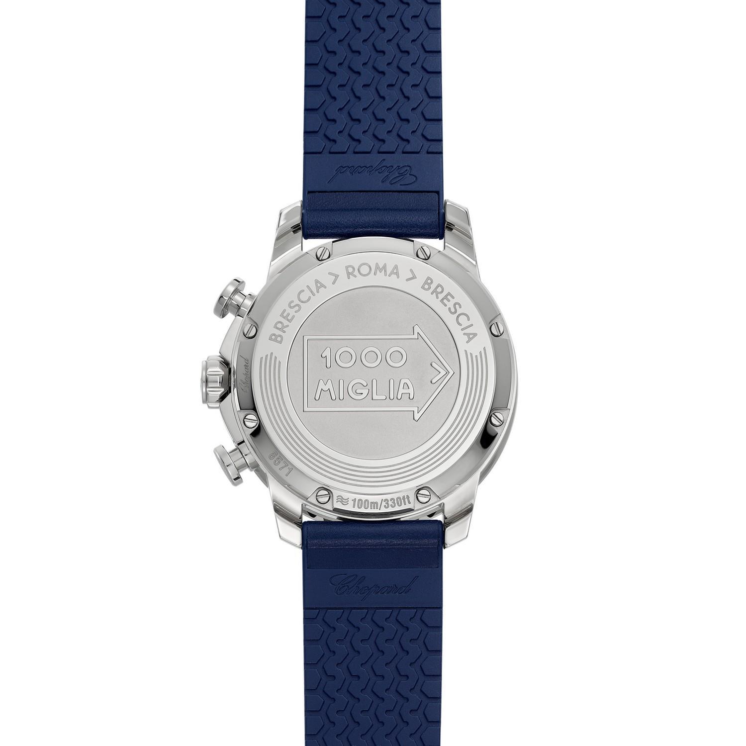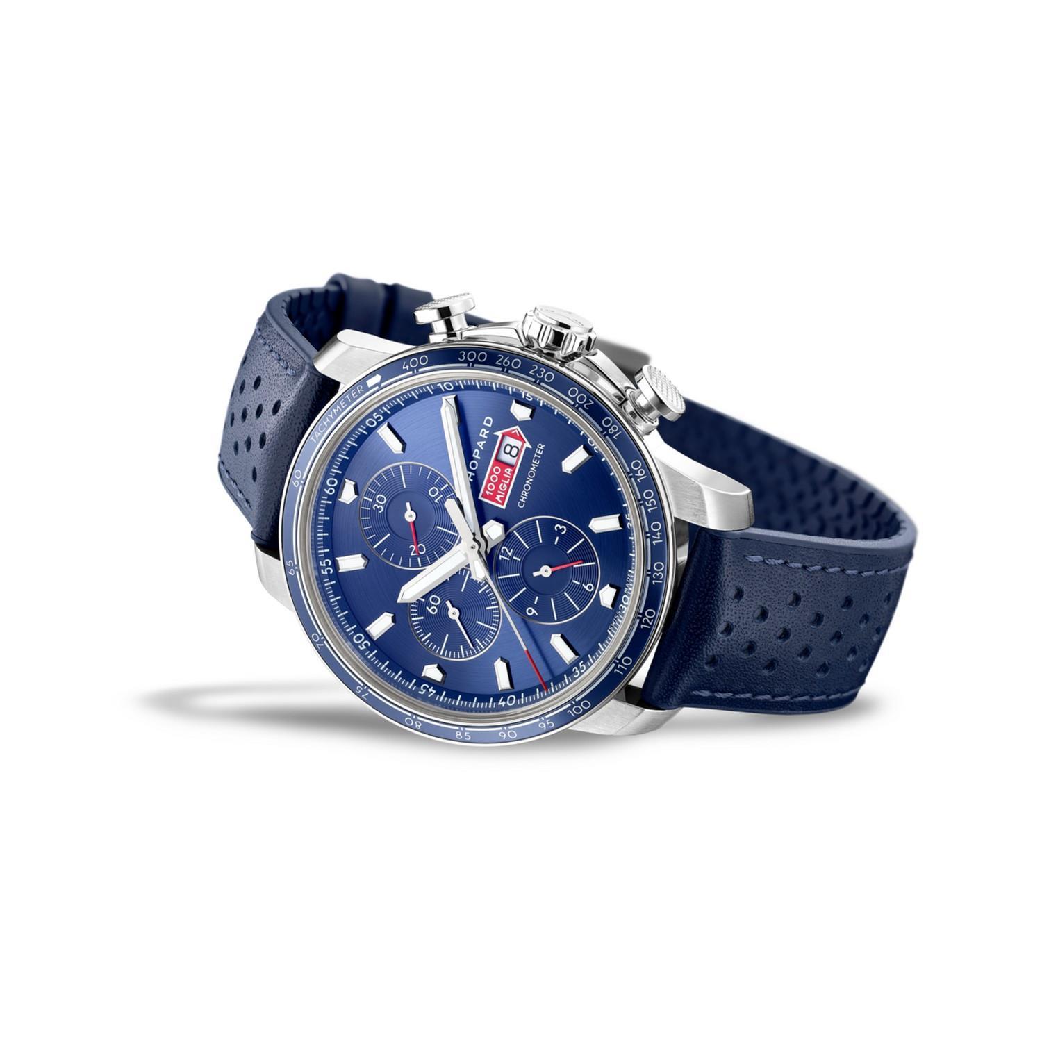 Im Oktober 2020 nahm Chopard voller Stolz seine Rolle als Hauptsponsor und offizieller Zeitnehmer von Italiens berühmtem Oldtimer-Rennen Mille Miglia wieder auf. Damit führt das Haus eine seit 1988 bestehende Tradition fort. Das Engagement von Chopard für dieses Event bietet Karl-Friedrich Scheufele, dem Co-Präsidenten, die Gelegenheit, seine Leidenschaft für den Motorsport zu zeigen, indem er an dem 1000-Meilen-Langstreckenrennen (1600 km) teilnimmt, bei dem die Fahrer von Brescia nach Rom und zurück fahren. Jedes Jahr präsentiert das Haus eine neue Kollektion Mille Miglia-Uhren, um dieses häufig als schönstes Rennen der Welt bezeichnete Event zu feiern. In dieser neuesten Ausgabe wird die Kollektion um einen Chronographen, den Mille Miglia GTS Azzurro Chrono aus Edelstahl (limitierte Auflage von 750 Exemplaren) und mit einem Zifferblatt, das an ein Armaturenbrett erinnert, erweitert. Dieses Modell überzeugt mit einem eleganten, Azzurro-blauen Zifferblatt, das einen schönen Kontrast zum Mille-Miglia-Rot bildet, das für die Details der Zeiger sowie für das unverkennbare Rennlogo in Pfeilform verwendet wird, welches das Datumsfenster einfasst.