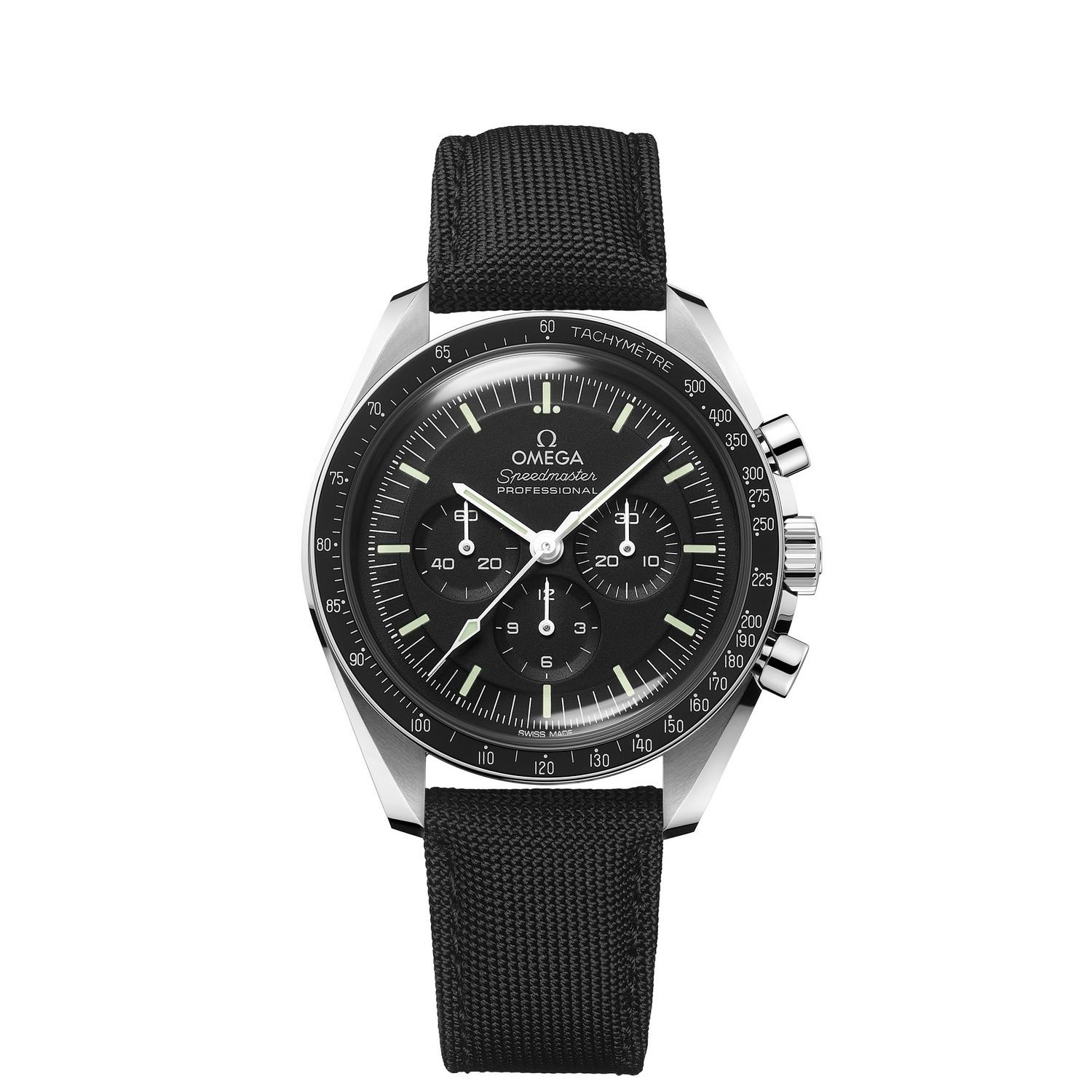Diese 42-mm-Moonwatch aus Edelstahl wird von einem Nylonarmband am Handgelenk gehalten. Das Zifferblatt wird von Hesalitglas geschützt, und in den Gehäuseboden wurde ein Seepferdchen-Medaillon geprägt. Inspiriert von der 4. Generation der Speedmaster, die auf dem Mond getragen wurde, besitzt das Modell auch ein asymmetrisches Gehäuse, ein schwarz abgestuftes Zifferblatt und den berühmten Punkt über der 90 auf dem Lünettenring aus eloxiertem Aluminium.