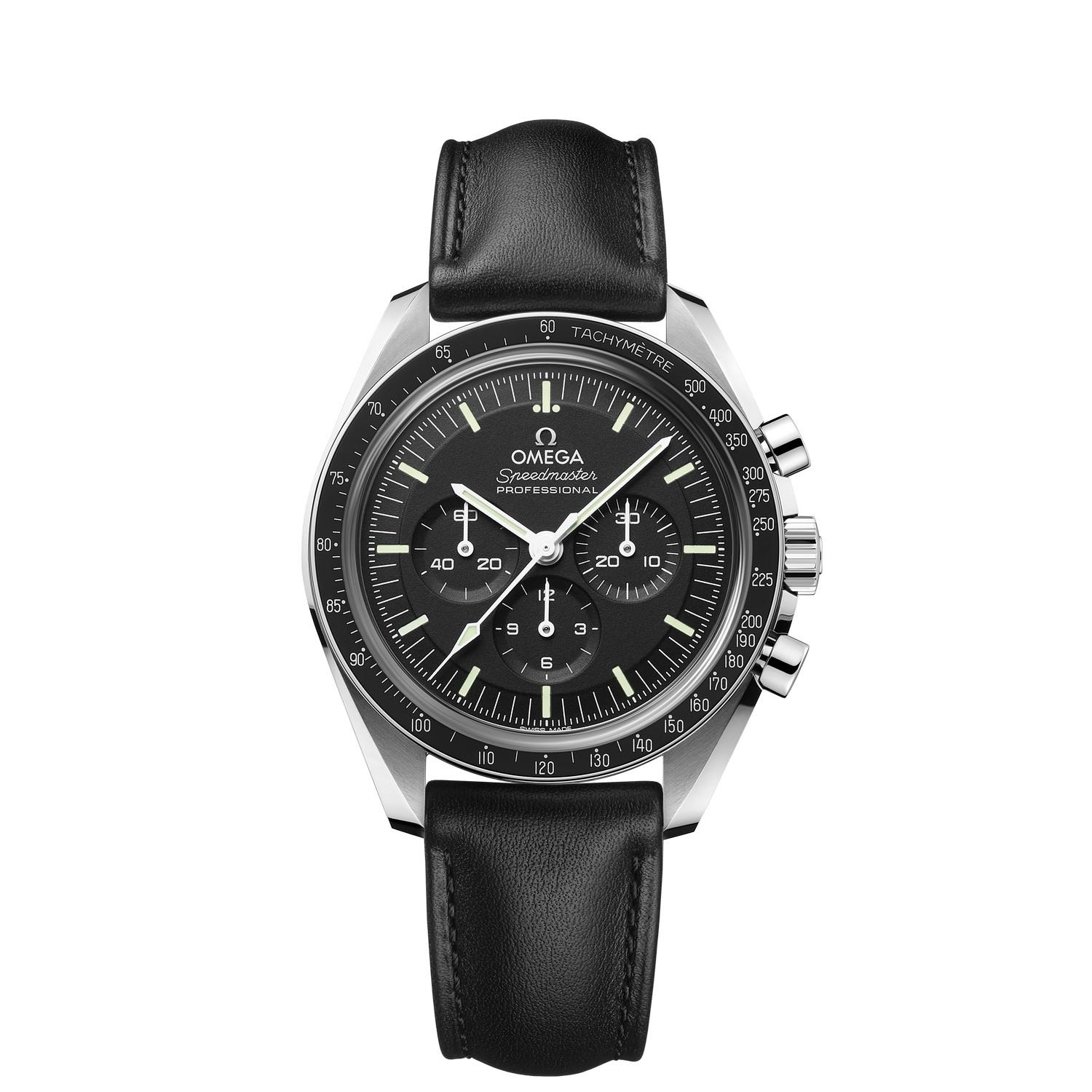 Diese 42-mm-Moonwatch aus Edelstahl wird von einem schwarzen Lederarmband am Handgelenk gehalten. Als Uhrglas und Gehäuseboden dient Saphirglas. Inspiriert von der 4. Generation der Speedmaster, die auf dem Mond getragen wurde, besitzt das Modell auch ein asymmetrisches Gehäuse mit appliziertem OMEGA Logo, ein schwarz abgestuftes Zifferblatt und den berühmten Punkt über der 90 auf dem Lünettenring aus eloxiertem Aluminium.