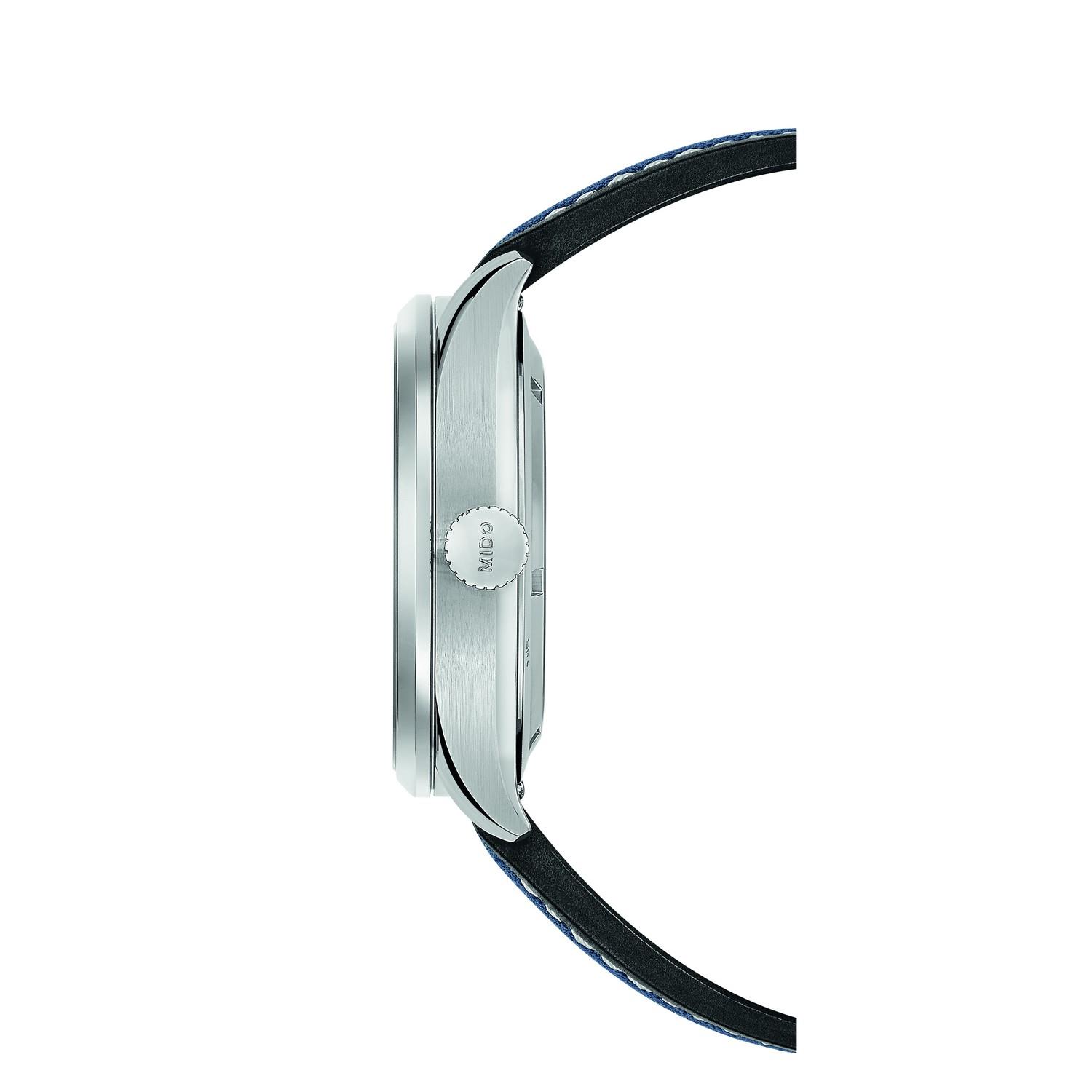 Auf dem abgestuften Zifferblatt der Multifort M erinnert ein vertikales Satin-Finish an die für die Kollektion charakteristischen Côtes de Genève. Makelloses Super-LumiNova® schafft Kontrast und optimale Ablesbarkeit der Zeiger und runden Indizes. Die legendäre Robustheit von Multifort schlägt im Rhythmus des berühmten Kalibers 80. Seine Gangreserve von bis zu 80 Stunden wird mit einer Spiralfeder aus Nivachron™ kombiniert – einem revolutionären Material, das beeindruckende Präzision bietet. Mido bietet die Multifort M mit werkzeuglosem Bandwechselsystem in Stahl- oder Textilausführung auf Kautschukbasis an.