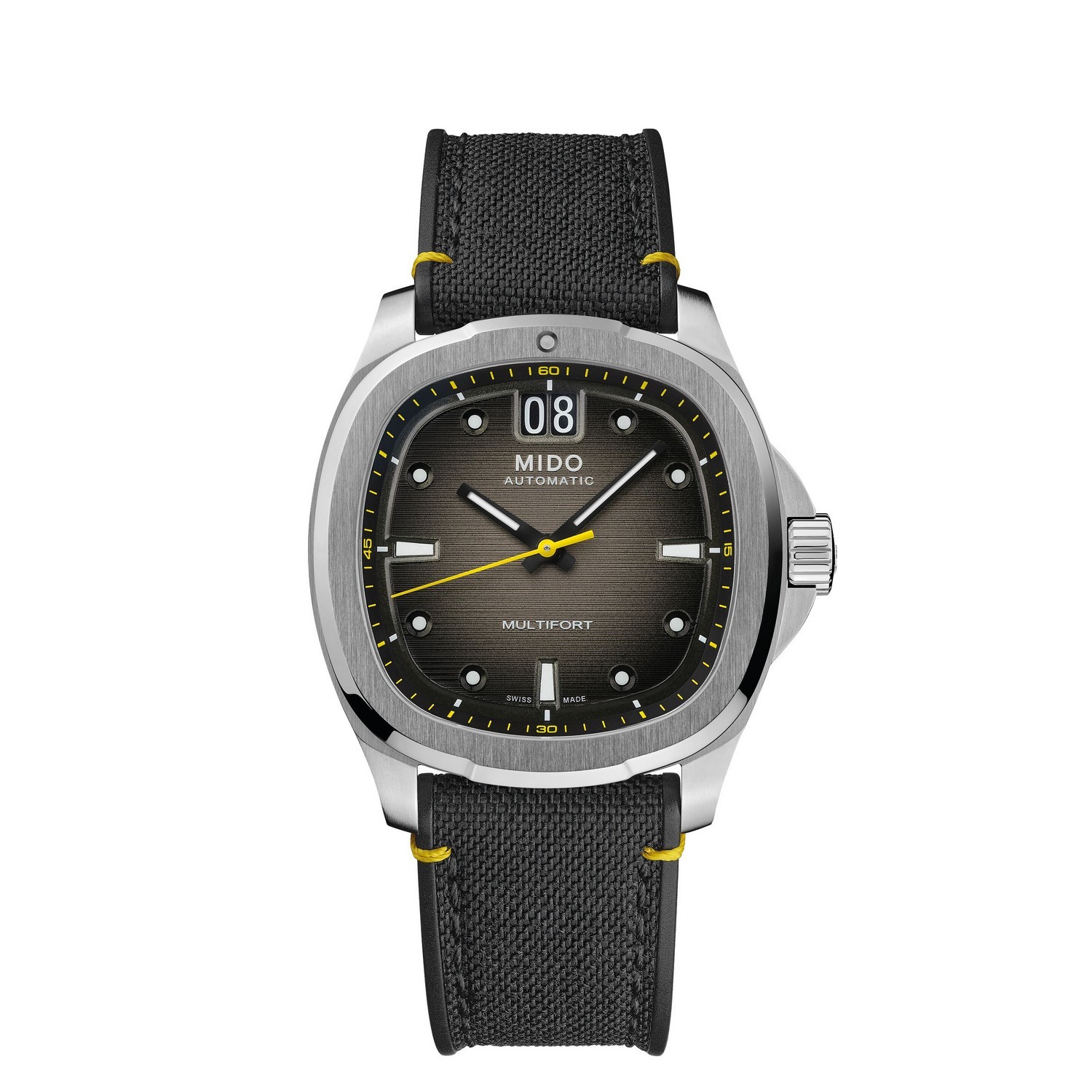 Ein genialer Rückblick! Das aus dem außergewöhnlichen Erbe von MIDO hervorgegangene Gehäuse in TV-Form kehrt bei der Multifort TV Big Date zurück auf die internationale Bühne, ebenso intensiv wie präzise, dank seines beeindruckenden mechanischen Uhrwerks. Das moderne und dynamische Design dieser Schweizer Uhr wird durch ein markantes horizontales Zifferblatt mit gebürstetem Finish und neben seiner besonderen Funktion unterstrichen: dem Großdatum bei 12 Uhr. Das beeindruckende Automatikwerk der neuesten Generation, das Kaliber 80, ist mit einer High-Tech-Spiralfeder aus Nivachron™ ausgestattet, die eine hervorragende Widerstandsfähigkeit gegen Stöße und Magnetfelder bietet.