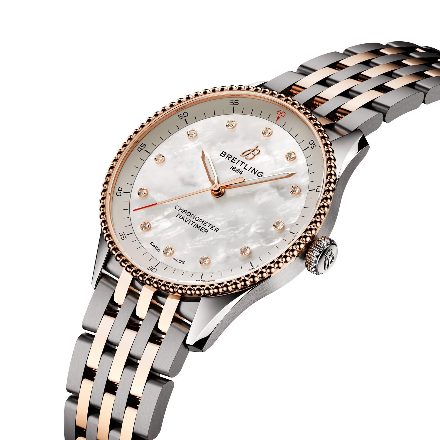Breitlings Ikone – für die Reise. Die Navitimer ist eine der bekanntesten Uhren, die je hergestellt wurden. Sie steht als eine der grossartigsten Uhren aller Zeiten auf den Sammlerlisten. Was 1952 als Instrument für Piloten begann, hat inzwischen eine tiefe Bedeutung für jeden, den dieser Zeitmesser auf seiner persönlichen Reise begleitet. Unsere Ikone kommt jetzt in den Grössen 36 und 32 mm für Frauen und Männer, die die Optik und Haptik einer Uhr mit kleinerem Durchmesser lieben. Während die 36-mm-Navitimer die Perlenlünette und den ikonischen kreisförmigen Rechenschieber aufweist, die der Navitimer ihr unverkennbares Aussehen verleihen, verzichtet die beeindruckende 32-mm-Variante auf den Rechenschieber zugunsten eines schlichteren Zifferblattdesigns, das auf den schlanken Durchmesser abgestimmt ist. Doch diese Blickfänger haben so viel mehr zu bieten als nur ihre schlanke neue Grösse. Pastelltöne, Perlmutt und rückverfolgbare Rohstoffe verbinden sich mit dezenten Feinheiten, um den Zeitmessern einen schmuckähnlichen Charakter zu verleihen – zusätzliche vielseitige Eleganz für die legendäre Navigationsuhr, die bereit für all Ihre Reisen ist.
