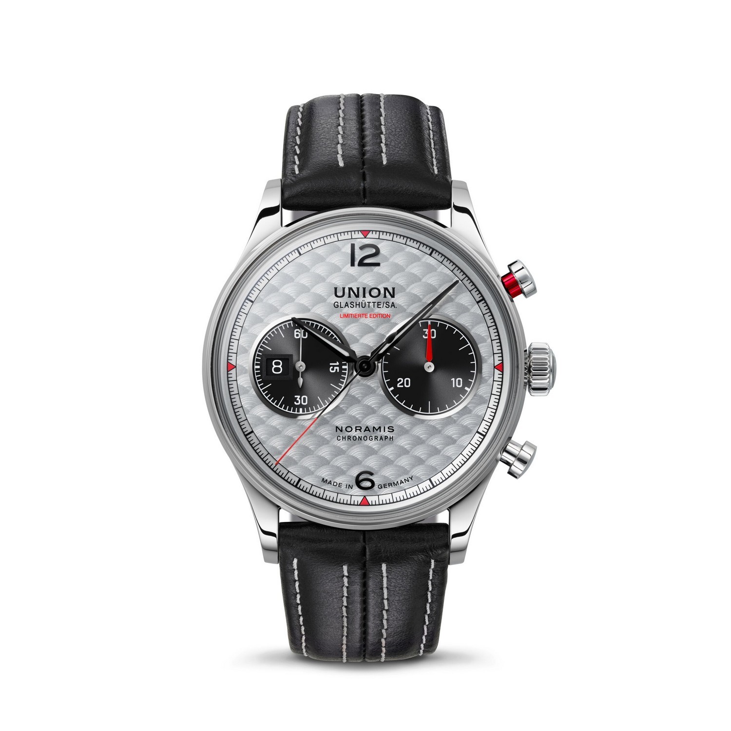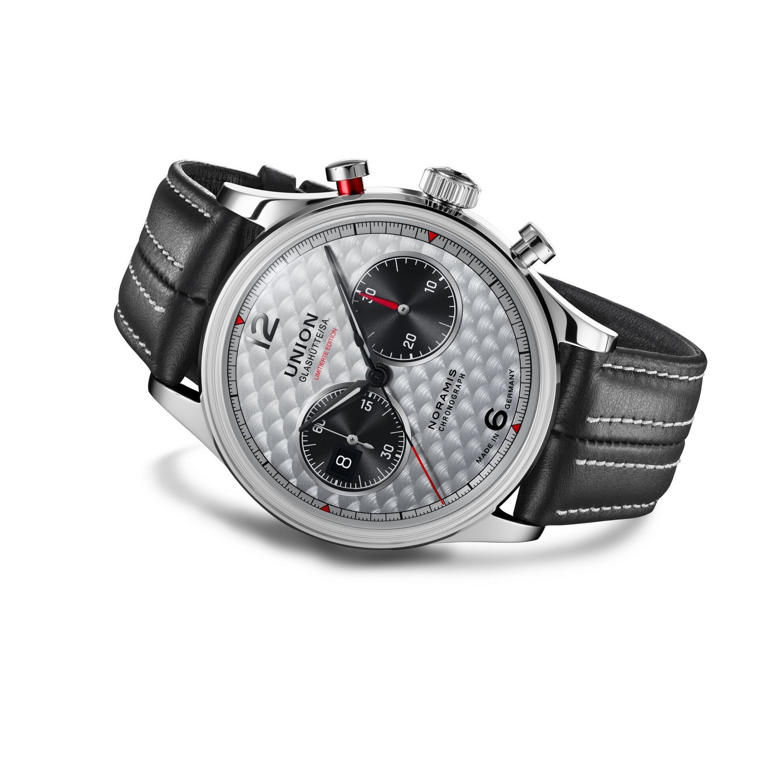 Der Noramis Chronograph Limitierte Edition Sachsen Classic 2025 ist inspiriert vom „Großen Werkmeister“ – ein sportlicher Zweisitzer aus den 50er Jahren. Das Zifferblatt des Chronographen greift die kreisförmigen Strukturen auf dem Armaturenbrett des Roadsters auf. Die feine Perlage ist von Hand geschliffen und macht jedes der streng limitierten Modelle zu einem außergewöhnlichen Unikat. Der rote Bereich des Drehzahlmessers findet sich in Elementen auf dem Zifferblatt und den Chronographenzeigern in derselben Farbe wieder. Passend zur Karosserie des Rennwagens aus Aluminium überwiegt aber die Farbe Silber. Das sportliche Aussehen wird von einem schwarzen Kalbslederband mit Doppelnaht komplettiert. Dieses einzigartige Modell ist weltweit auf 350 Stück limitiert.
