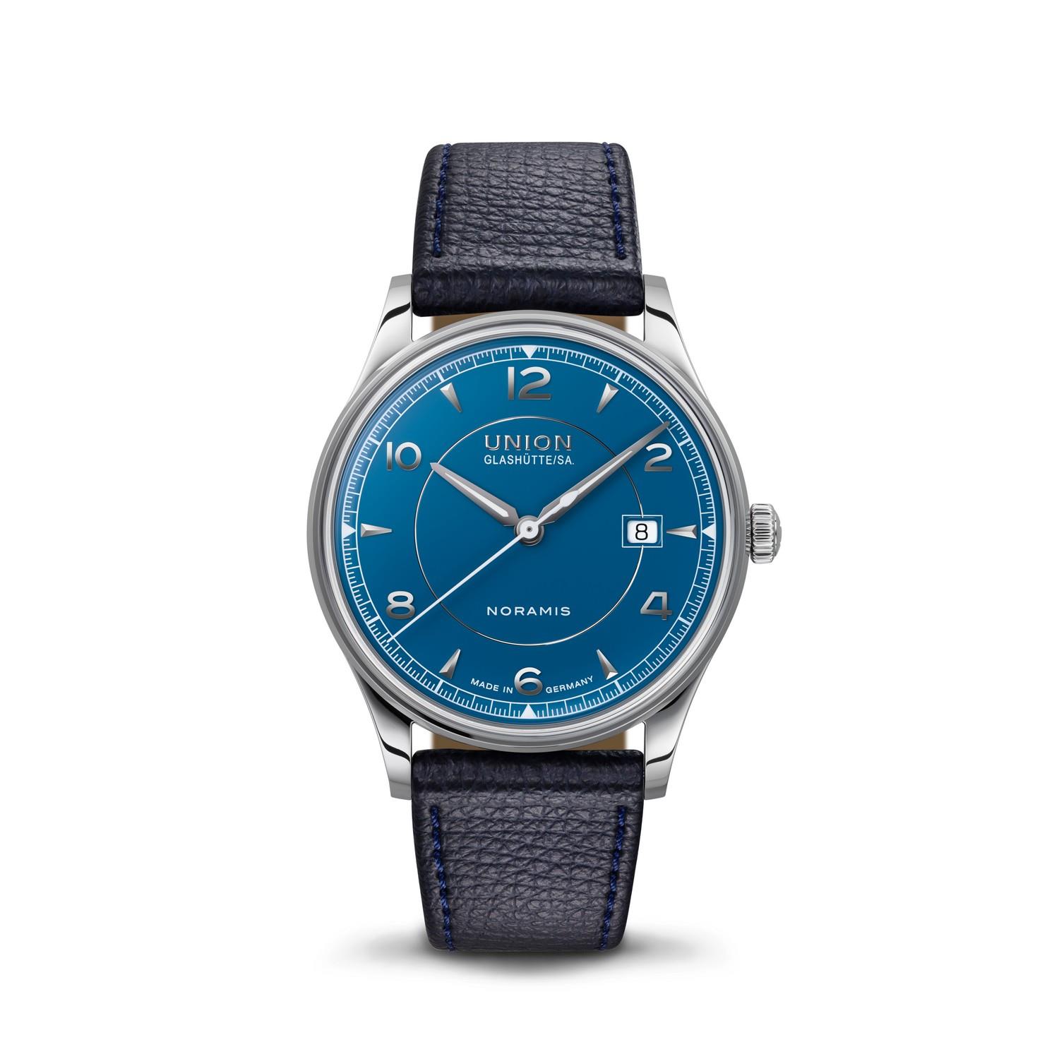 Die Union Glashütte Noramis Kollektion steht für die Eleganz der 50er und 60er Jahre. Das anmutig gewölbte Zifferblatt dieser Noramis Datum präsentiert sich elegant in schwarzem Emaillelack. Vernickelte Indizes treffen auf Super-LumiNova® -beschichtete Zeiger und eine Datumsanzeige bei 3 Uhr. Der elegante Zeitmesser mit dem mechanischen Herzen ist zudem wasserdicht bis zu einem Druck von 10 bar (100 m).
