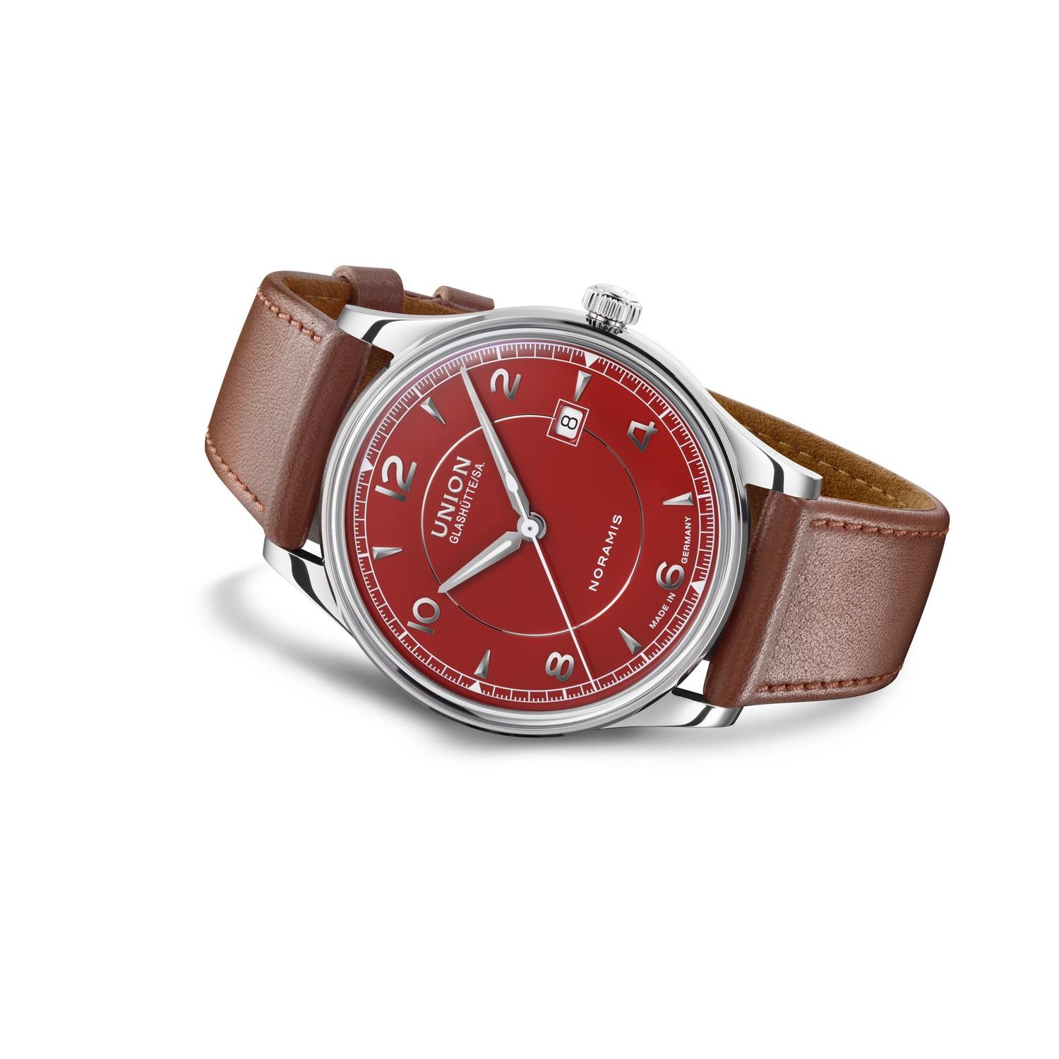 Die Union Glashütte Noramis Kollektion steht für die Eleganz der 50er und 60er Jahre. Das anmutig gewölbte Zifferblatt dieser Noramis Datum präsentiert sich elegant in schwarzem Emaillelack. Vernickelte Indizes treffen auf Super-LumiNova® -beschichtete Zeiger und eine Datumsanzeige bei 3 Uhr. Der elegante Zeitmesser mit dem mechanischen Herzen ist zudem wasserdicht bis zu einem Druck von 10 bar (100 m).