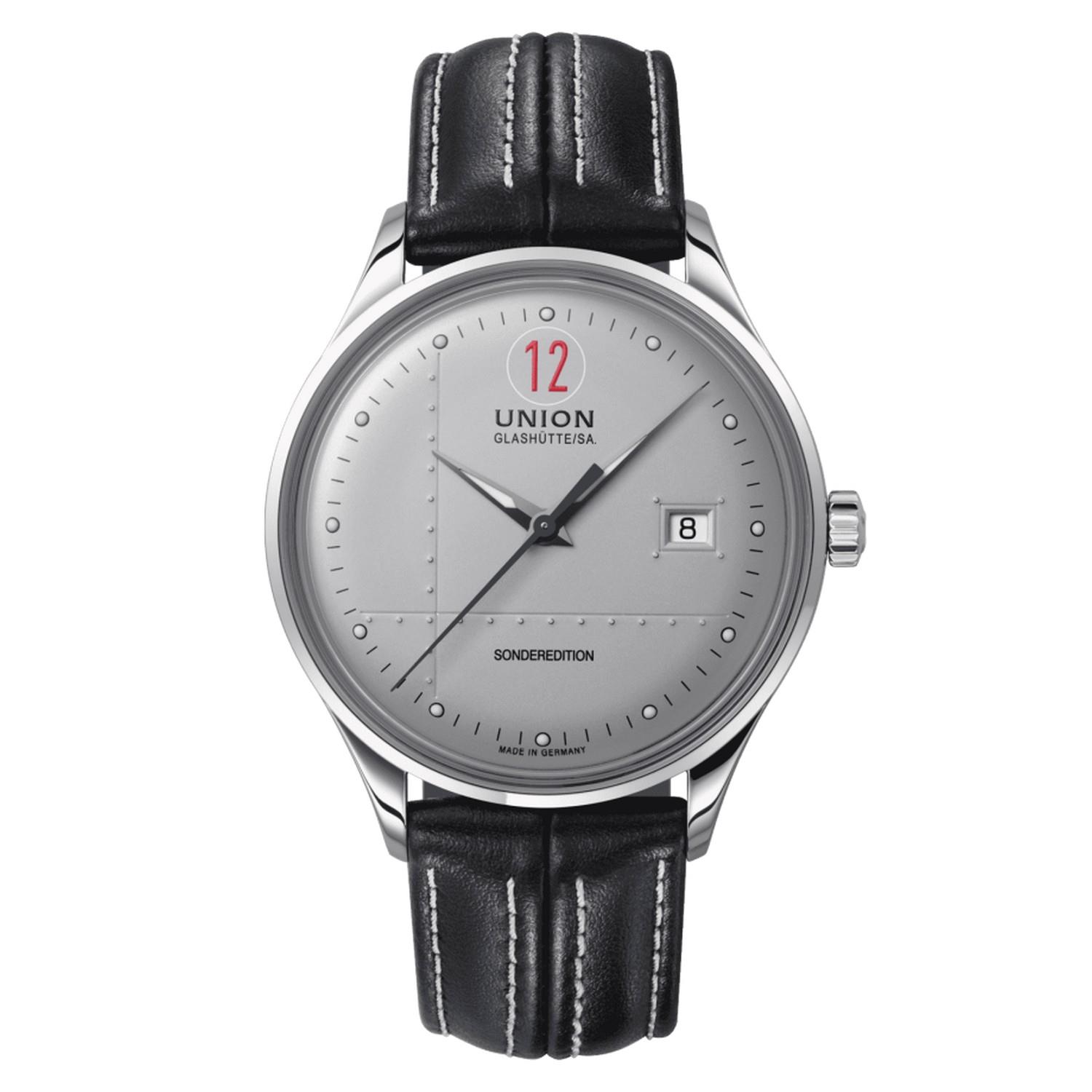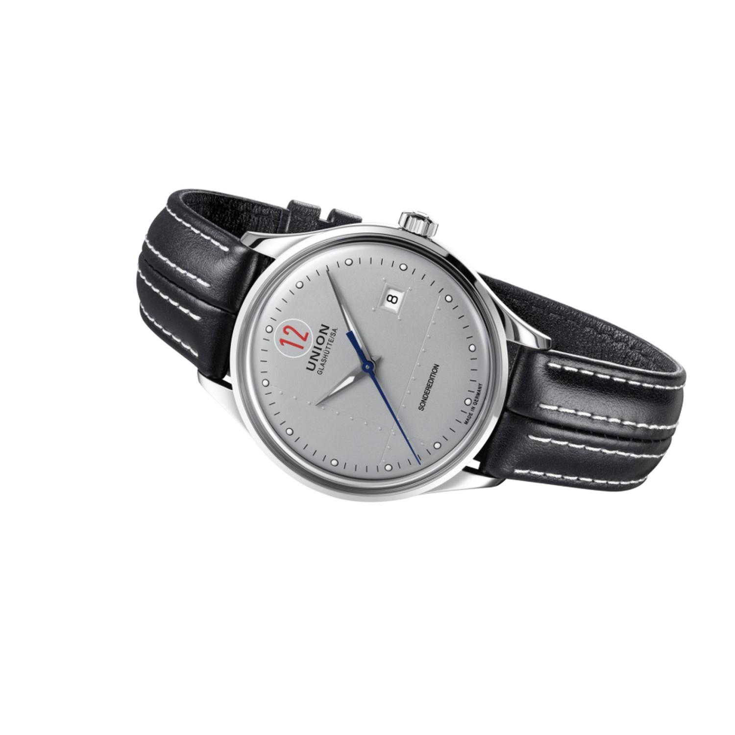 Die Union Glashütte Noramis Kollektion steht für die Eleganz der 50er und 60er Jahre. Das unterteilte Zifferblatt erinnert an das Cockpit nostalgischer Klassiker. Während der Ring mit der Minuteneinteilung in elegantem Grau gehalten ist und im feinen Sonnenschliff erstrahlt, kommen auf dem mattschwarzen Innenkreis das Datum bei 6 Uhr und die spitz zulaufenden Zeiger zur Geltung. Durch das extrem gewölbte, beidseitig entspiegelte Saphirglas kann ihr Zusammenspiel gut betrachtet werden. Geprägte, kursive Ziffer-Indizes treffen auf vernickelte, Super-LumiNova®-beschichtete Stunden- und Minutenzeiger sowie eine Datumsanzeige bei 3 Uhr. Der elegante Zeitmesser mit dem mechanischen Herzen ist zudem wasserdicht bis zu einem Druck von 10 bar (100 m).