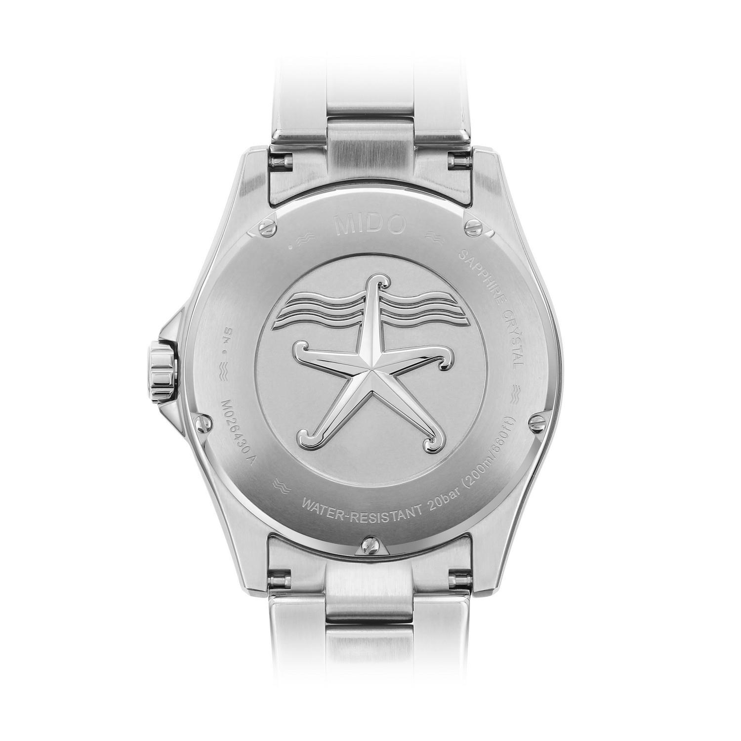 Das Zifferblatt der Uhr Ocean Star 200 wartet mit Indexen mit Super-LumiNova-Beschichtung und skelettierten Zeigern auf. Im Sinne einer besseren Ablesbarkeit im Wasser sind die Indexe bei 6 und 12 Uhr als zwei Punkte gestaltet. Bei diesem Zeitmesser handelt es sich um eine wasserdichte Uhr mit einer Wasserdichtheit von bis zu 20 bar. Mit seiner Form schützt das Gehäuse die Krone, während den Boden eine Gravur des Ocean-Star-Logos ziert. Weiterhin weist das Automatikwerk der Uhr eine Gangautonomie von bis zu 80 Stunden auf.
