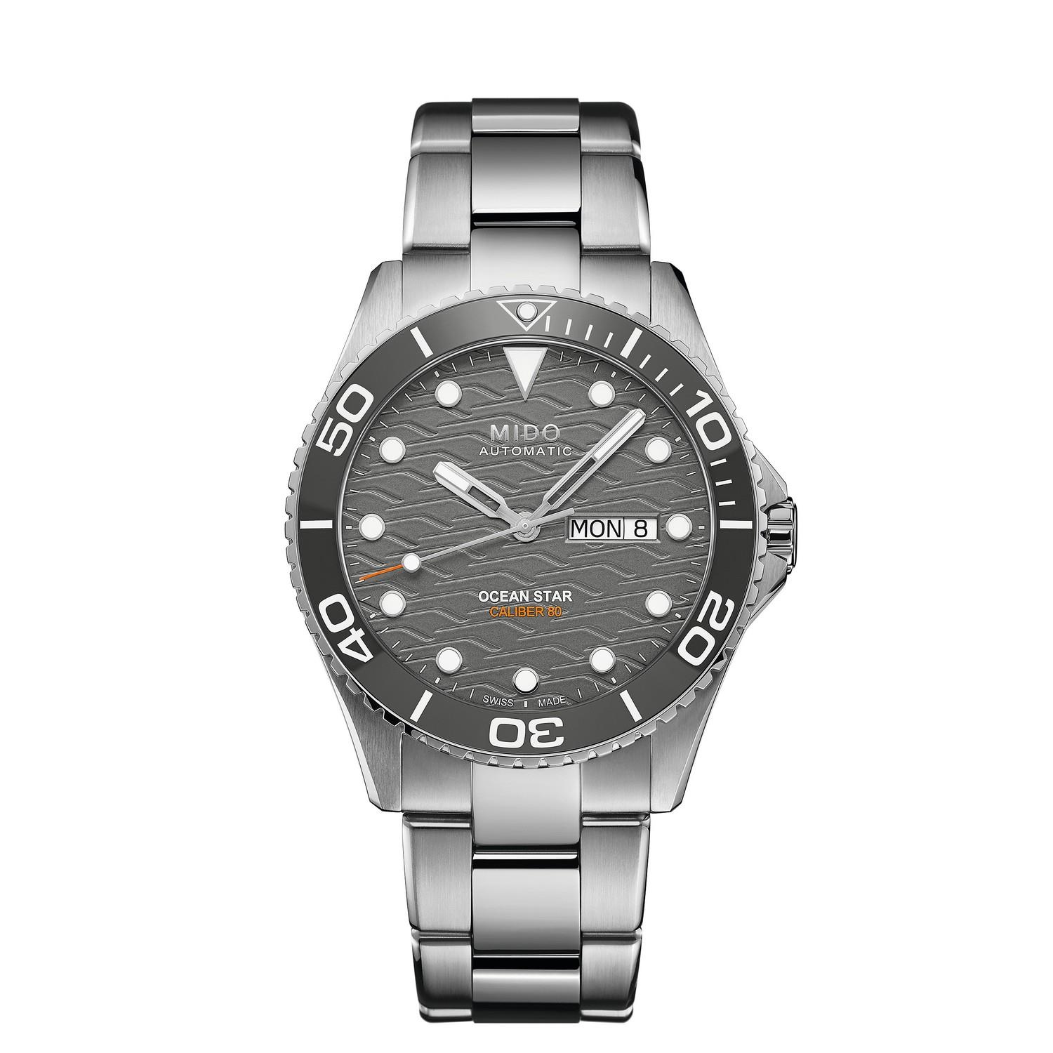 Mido benutzt Keramik – eines der herausragendsten Materialien in der Uhrmacherkunst – auf der einseitig drehbaren Lünette seiner Ocean Star 200C. Das Zifferblatt ist mit einer welligen Textur verziert und hat aufgesetzte Indizes, die mit weißem Super-Luminova® beschichtet sind. Diese Uhr ist bis zu 20 bar wasserdicht, wobei die Gehäuseform einen zusätzlichen Schutz für die verschraubte Krone bietet. Auf dem verschraubten Gehäuseboden ist das Ocean Star-Logo eingraviert. Das Automatikwerk hat eine Gangreserve von bis zu 80 Stunden.