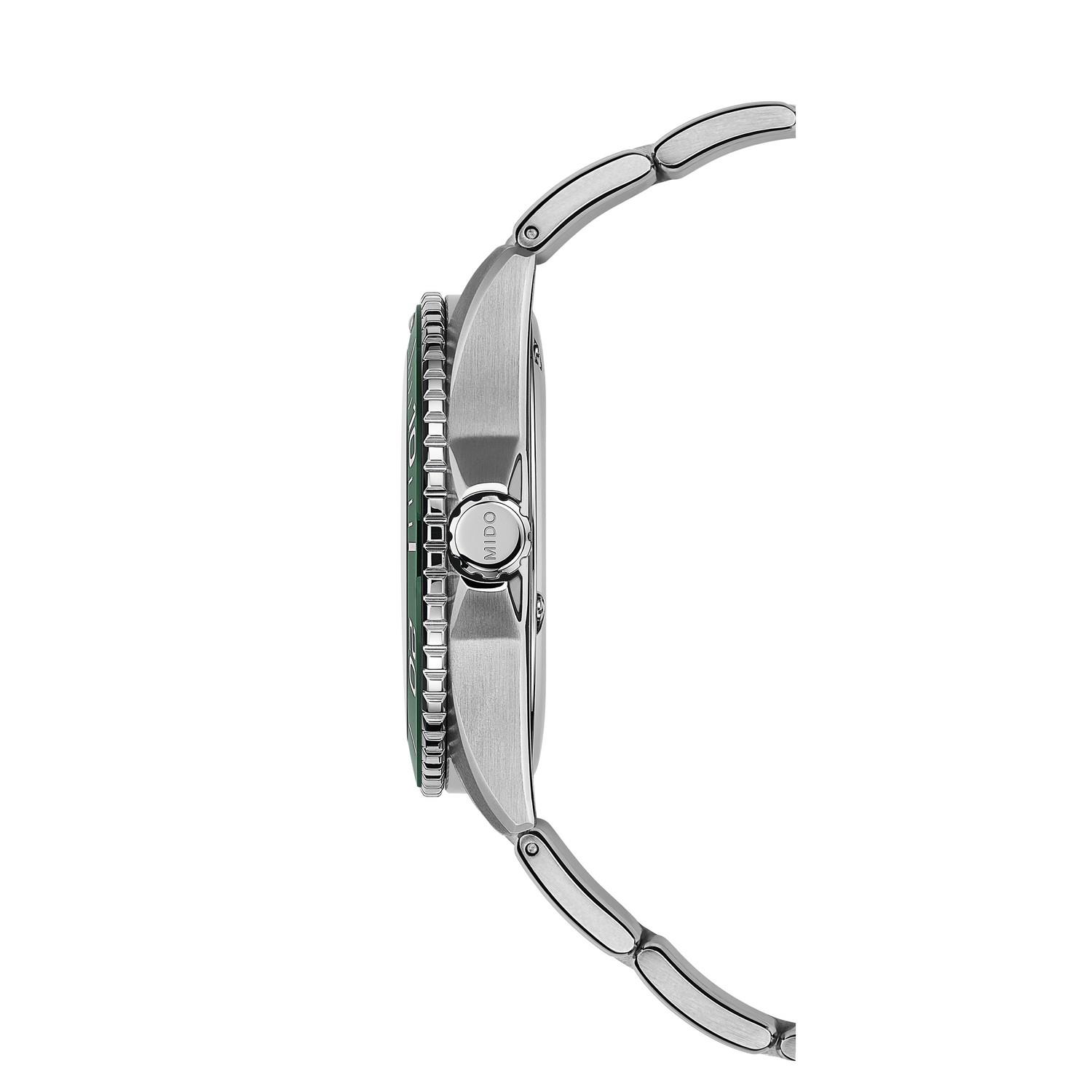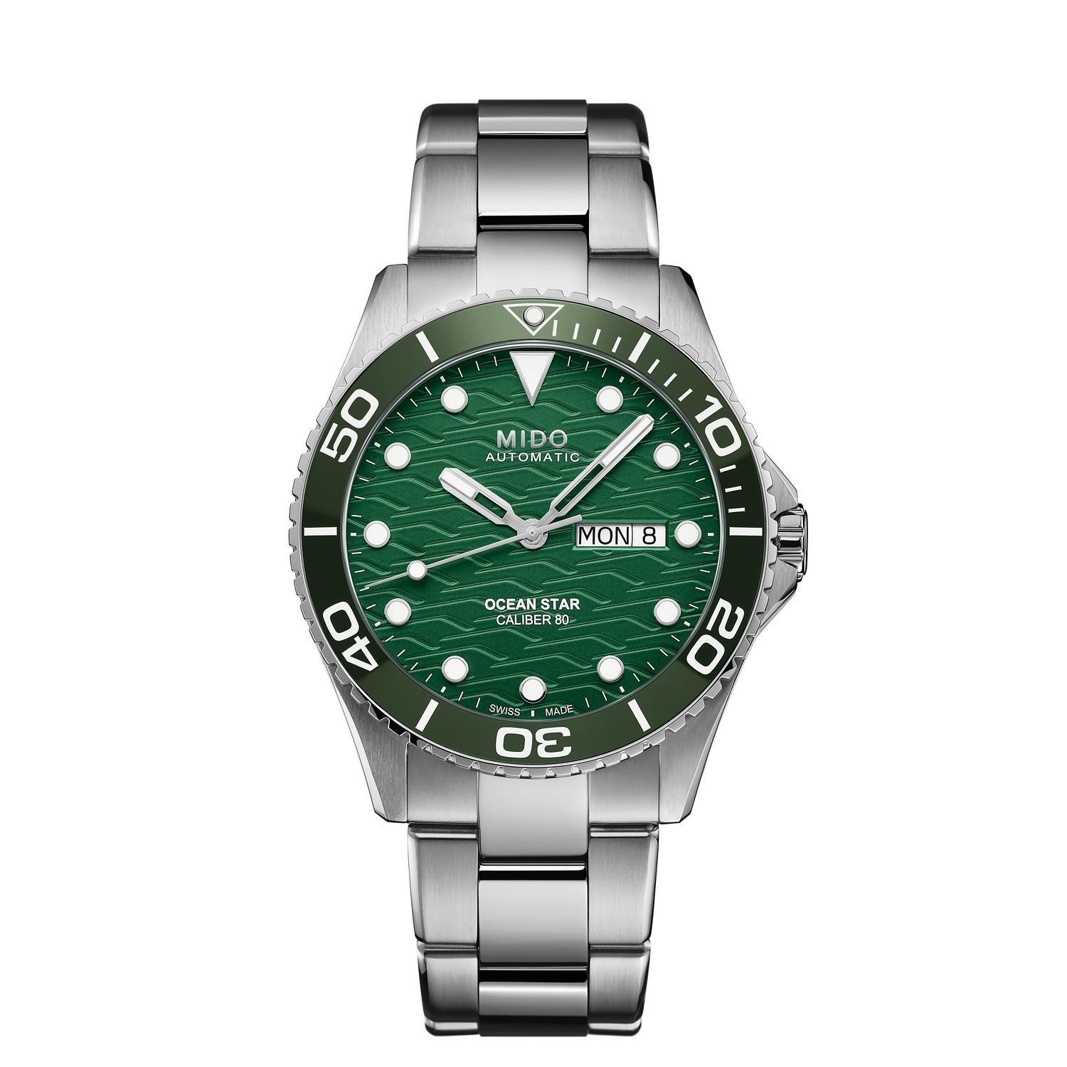 Mido benutzt Keramik – eines der herausragendsten Materialien in der Uhrmacherkunst – auf der einseitig drehbaren Lünette seiner Ocean Star 200C. Das Zifferblatt ist mit einer welligen Textur verziert und hat aufgesetzte Indizes, die mit weißem Super-Luminova® beschichtet sind. Diese Uhr ist bis zu 20 bar wasserdicht, wobei die Gehäuseform einen zusätzlichen Schutz für die verschraubte Krone bietet. Auf dem verschraubten Gehäuseboden ist das Ocean Star-Logo eingraviert. Das Automatikwerk hat eine Gangreserve von bis zu 80 Stunden.