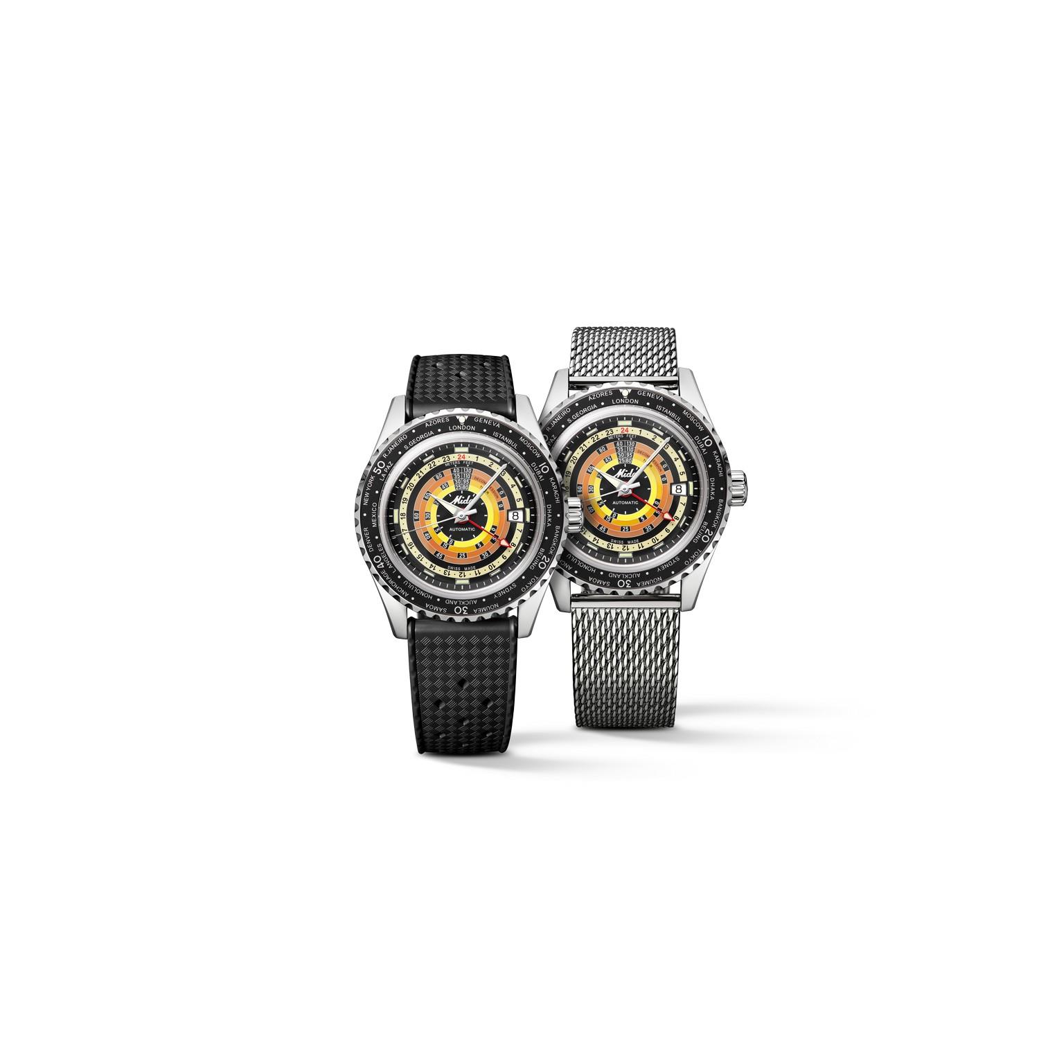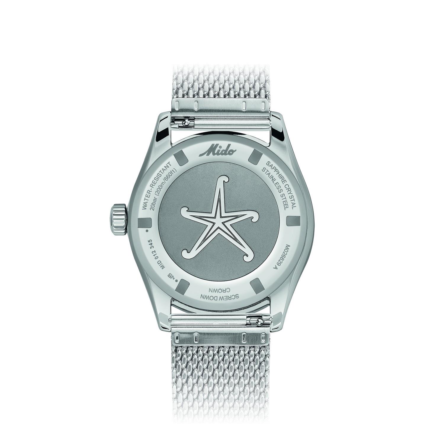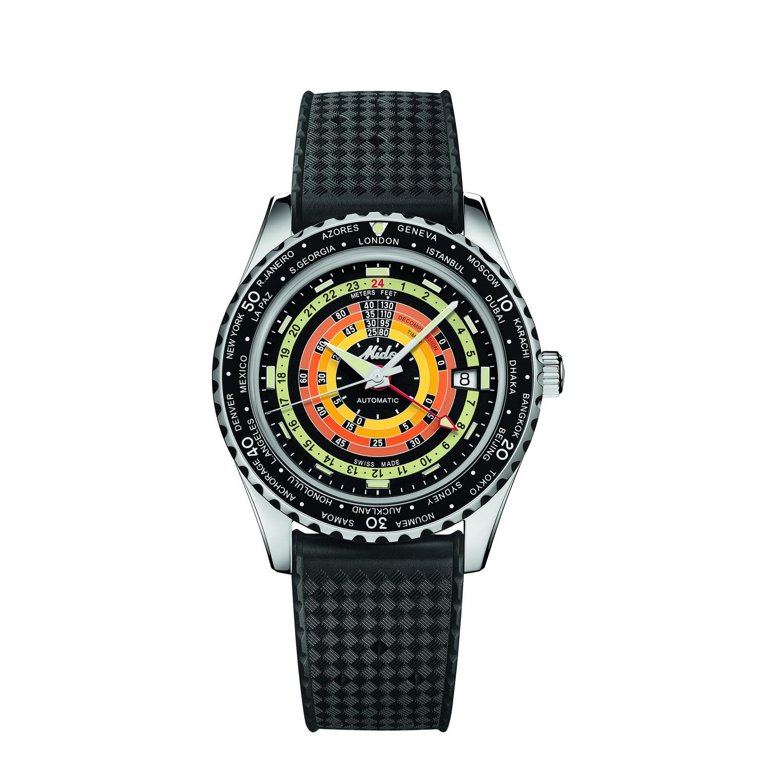 Unwiderstehlicher Neo-Vintage-Stil, leuchtende Farben und modernste Technologie: Die neue Ocean Star Decompression Worldtimer bewahrt diesen Vintage-Charme und treibt sie mit einer zusätzlichen Zeitzonenanzeige zu neuen Horizonten. Mido hat die neuesten Technologien in ihrem kontinuierlichen Streben nach Exzellenz eingesetzt: Super-LumiNova®, ein Saphirglas im Glasbox-Stil, das beeindruckende Kaliber 80 mit Nivachron™-Spiralfeder und GMT-Funktion sowie ein einfach zu wechselndes zusätzliches Armband. Auf dem verschraubten Gehäuseboden dieses neuen Modells, das bis zu einem Druck von 20 bar (200 m/660 ft) wasserdicht ist, ist das Markenzeichen der Ocean Star eingraviert: ein Seestern.