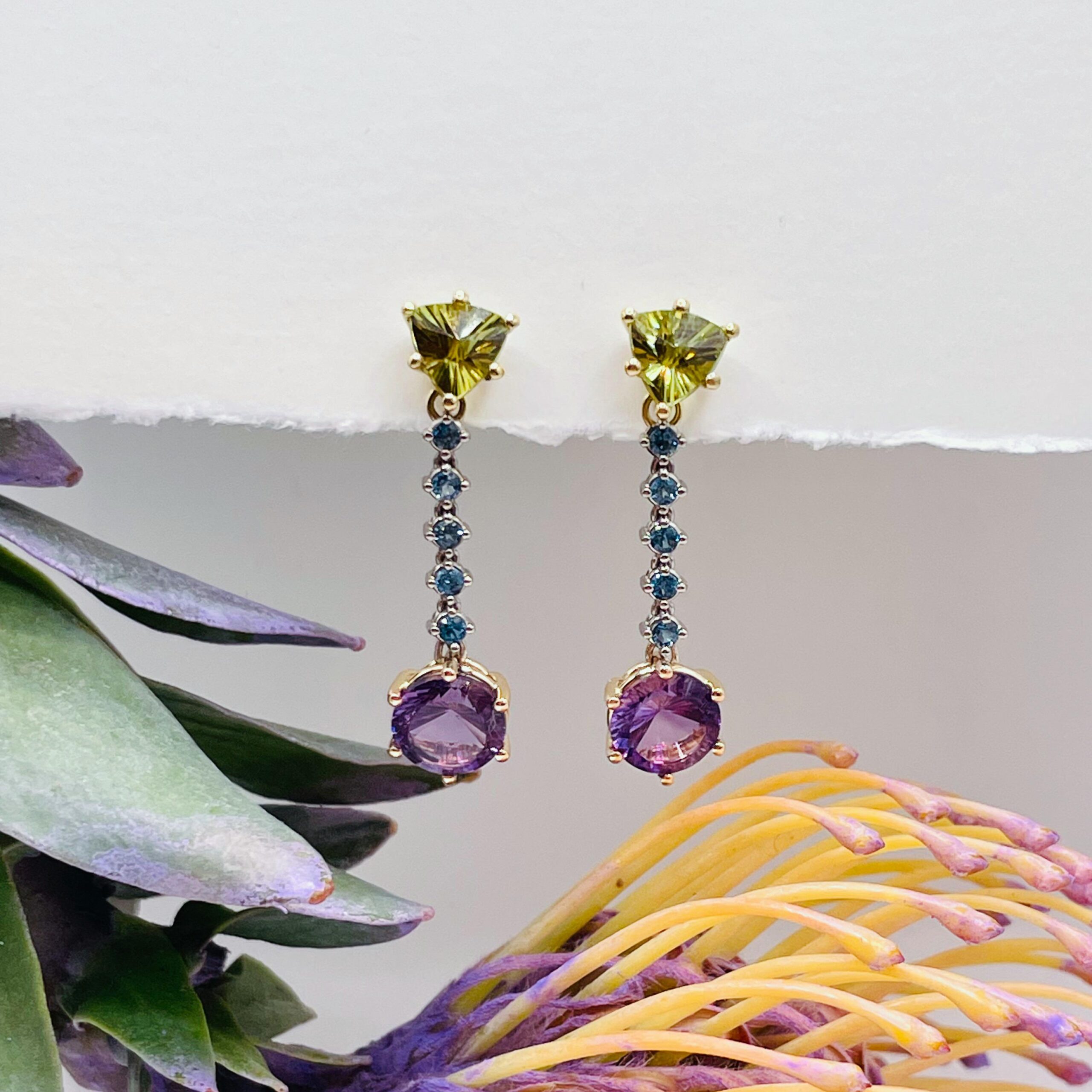 Diese Ohrringe mit bunten Edelsteinen nehmen jede Bewegung auf und funkeln mit sich selbst um die Wette. Grüne Grossulare, Topase und Amethyste bilden eine außergewöhnliche Farbkombination.