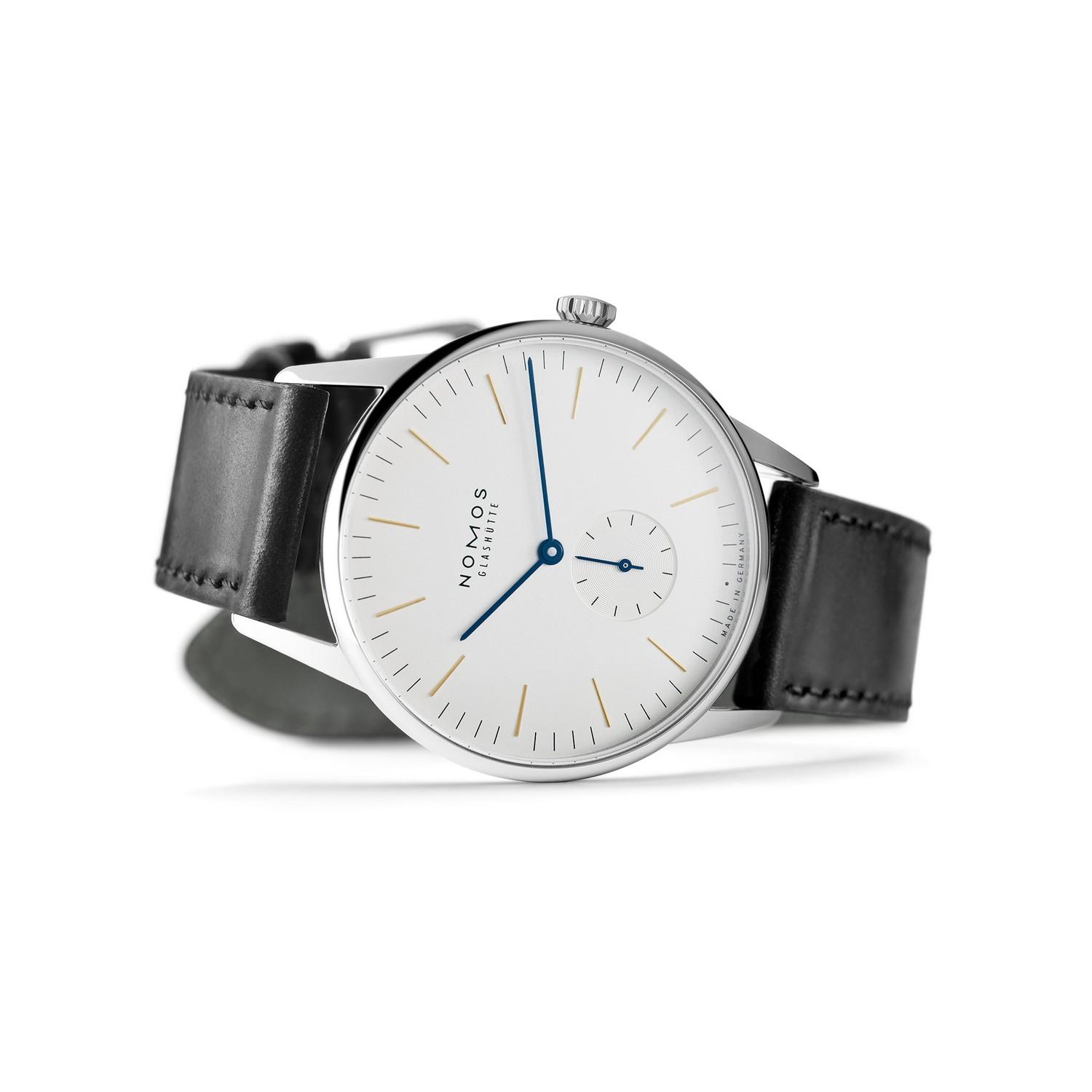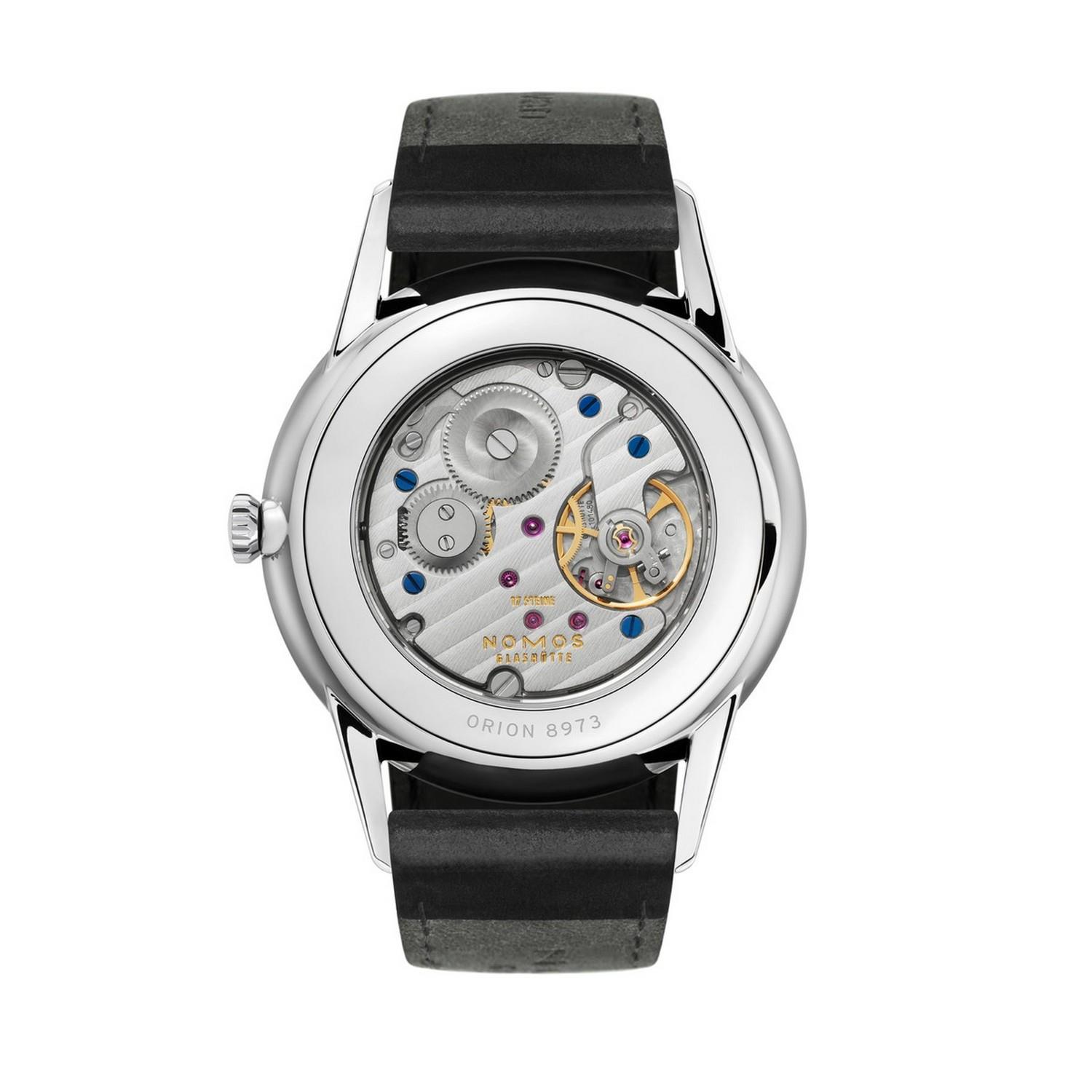 Mehr Orion: Mit 38 Millimetern Durchmesser reiht sich diese Uhr ein in die Reihe der größeren NOMOS-Modelle. Wirkt aber mit gewölbtem Blatt und Saphirglas besonders flach und elegant. Große Klasse auch: die temperaturgebläuten Zeiger auf weiß versilbertem Zifferblatt. Darunter arbeitet Handaufzugswerk Alpha – zuverlässig und höchst präzise.