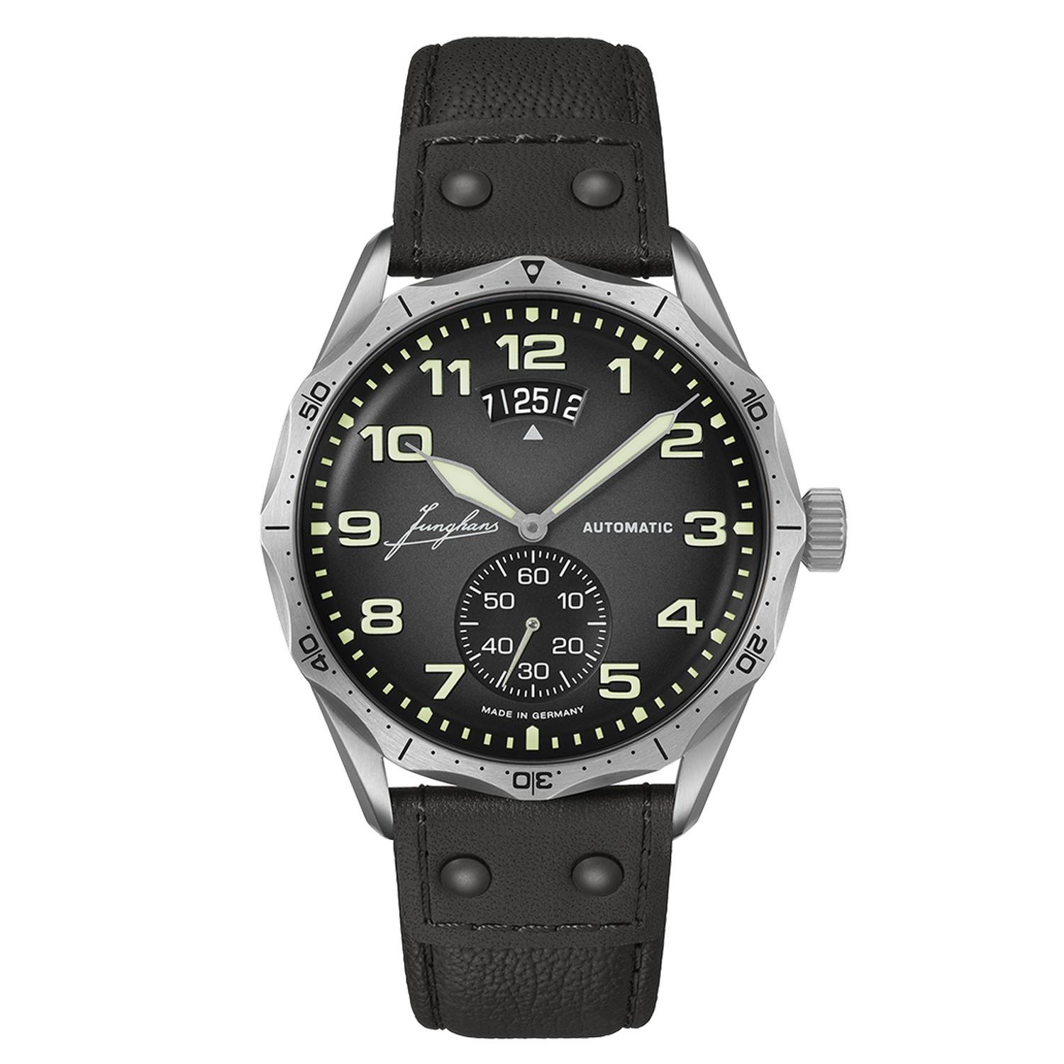 Lebenswichtig für Piloten, erfreulich für Uhrenliebhaber: die gute Ablesbarkeit der Pilot Automatic. Authentischen Bordinstrumenten nachempfunden, verstärken die großen Zahlen der Datumsanzeige den Cockpit-Charakter der Uhr. Die Kleine Sekunde mit rotem Zeiger sorgt für zusätzliche Übersichtlichkeit. Das historische Logo auf dem Zifferblatt weist auf die traditionelle Verbundenheit von Junghans zur Luftfahrt hin.